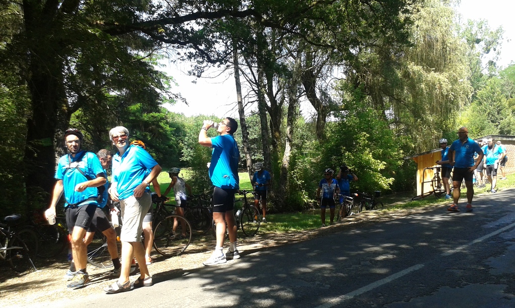 Une bonne pause à l'ombre au lavoir de La Chapelle-Enchérie a permis à chacun de se désaltérer, se restaurer , se rafraîchir en mettant les pieds dans l'eau et de poursuivre allègement les discussions entamées sur le vélo.
