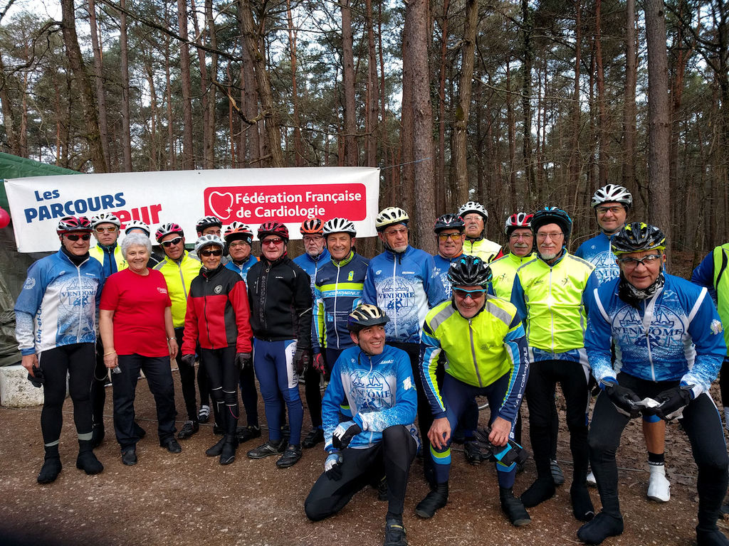 Presque tous les cyclos sont passés déposer leur obole sur le site du Parcours du cœur prévu ce dimanche sur notre sortie. Une pause appréciée des bénévoles du club Cœur et Santé de Vendôme qui ont fait remarquer notre assiduité à ce rendez-vous annuel, la responsable se prêtant même à la photo avec quelques cyclos du groupe.