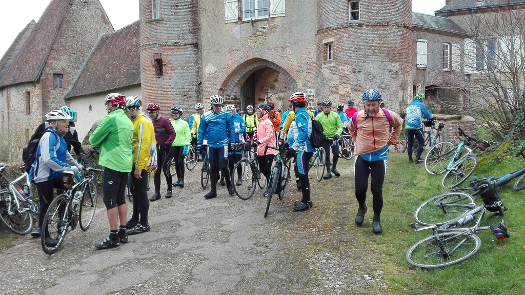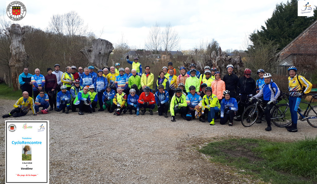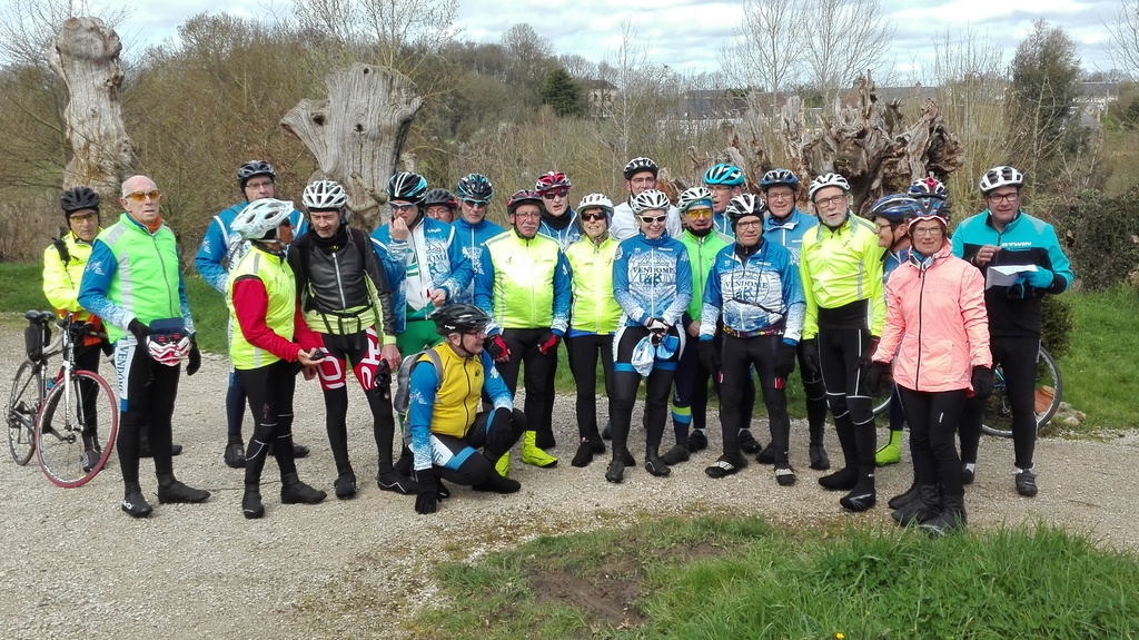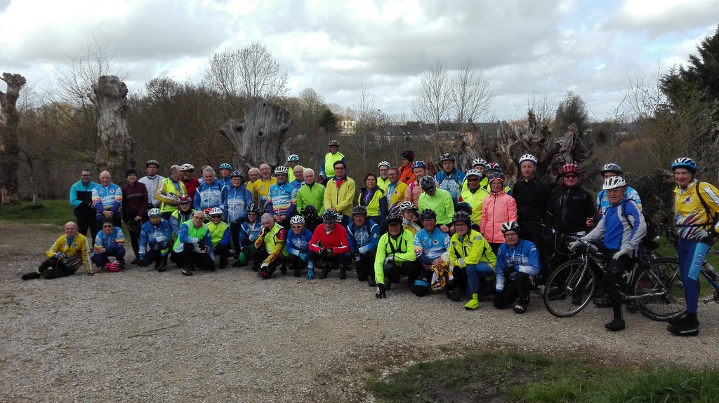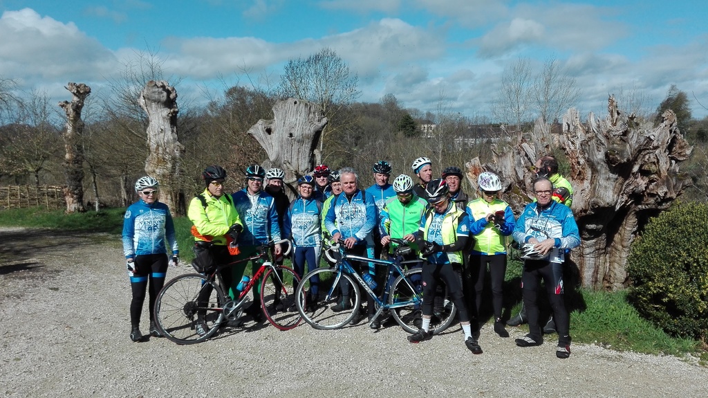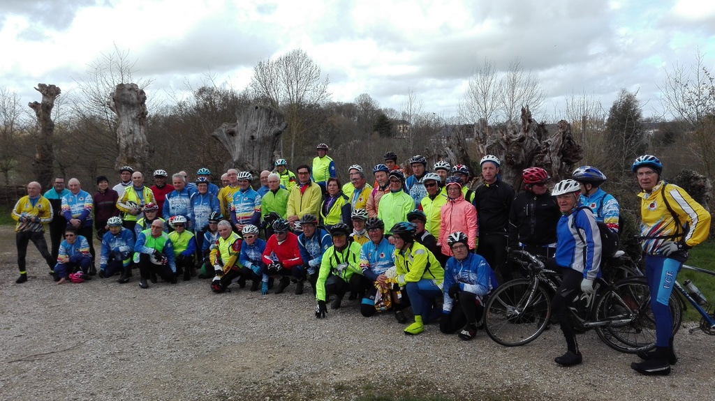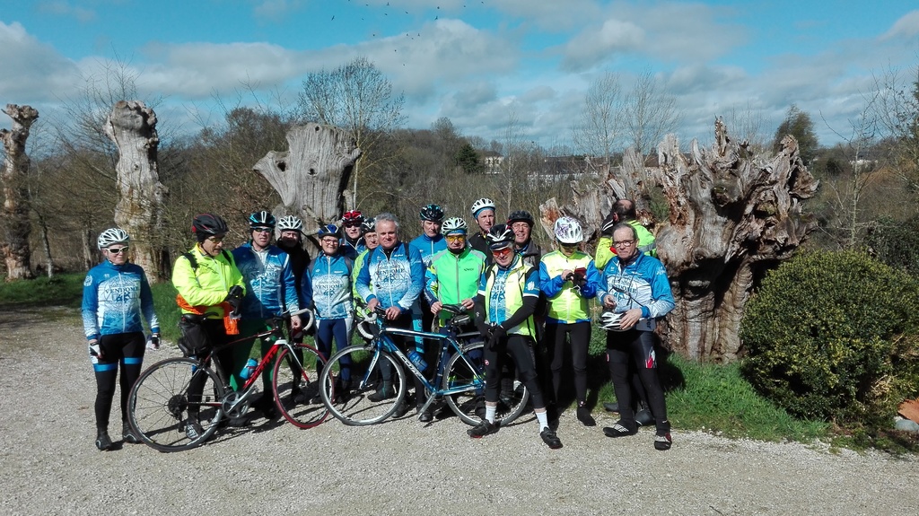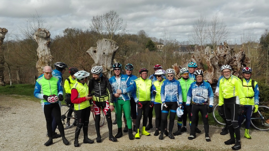 Malgré des prévisions de pluie et de vent fort, tous les vendômois étaient au rendez-vous, prêts à partir sous ce ciel gris mais il manquait les Tourangeaux…La journée commençait mal ; le chauffeur de leur remorque à vélos victime d’une panne de réveil a repoussé leur arrivée à 9h30. Pour éviter de trop se refroidir, nous décidons de partir doucement en 2 groupes (sauf Jean-Pierre et Pascale attendant leurs co-équipiers) ; de faire éventuellement une rallonge pour se retrouver tous à Boursay pour la photo de groupe devant les trognes. C’était sans compter sur les crevaisons ; à peine sorti de Naveil, la première immobilise le premier groupe avec en prime quelques gouttes. Les nuages vite chassés laissent place au soleil et nous roulons gentiment sur les petites routes du Perche et faisons juste une petite rallonge avant St Marc du Cor où nous repassons devant le deuxième groupe, direction Choue puis Boursay où en attendant les 2 derniers groupes, nous découvrons le site des trognes. Notre attente sera longue, les derniers vendômois victimes d’une crevaison à la sortie de Choue nous paraîtront lents à arriver ; ce n’est rien à côté des Tourangeaux qui,partis presque 1h après nous en auront 6 avant de nous rejoindre ! De gros nuages cachent de nouveau le soleil ; le vent se lève, et la température a bien chuté lorsqu’ils nous rejoignent. Nous faisons vite quelques photos pour leur laisser le temps de voir rapidement le site et malheur au moment de reprendre nos montures, l’un d’entre eux s’aperçoit que son pneu est ouvert sur quelques centimètres et devra le changer. Il est midi et quart lorsque nous repartons enfin, bien refroidis ; le vent est fort, la pluie menace. Afin d’être à 13h30 à Souday pour le repas, nous décidons de raccourcir le parcours en allant directement à Arville où nous prenons le temps d’un arrêt photos à la Commanderie puis Oigny et enfin Souday où nous sommes juste à l’heure et ouf ! contents de vite se mettre au sec car sur les 2 derniers kilomètres les gouttes commençaient à s’intensifier. Cette pause nous réchauffe avec ce bon repas cyclo, simple mais bien cuisiné, bien garni et pendant lequel nous regardons (un peu inquiets) la pluie qui ne cesse pas. Heureusement, l’animation de Jean-Pierre avec son jeu questionnaire sur le patois percheron nous fera diversion. Le temps de tous se regarnir, sortir nos vélos, il est presque 16h lorsque nous repartons de Souday mais par chance, la pluie a cessé et même si le ciel est menaçant, le vent est moins fort ; moins défavorable que prévu et l’humeur est joyeuse. Quelques grosses gouttes juste avant Baillou nous refroidiront un peu mais bien moins que les crevaisons ; nous en aurons 6 sur le retour ! Pratiquement une à chaque village ; la dernière à 1km de l’arrivée ! Elles nous ont sûrement évité de prendre la pluie car à celle de Rahay et Champrond nous avons vu passer devant nous de gros nuages s’épanchant fortement peu après et la route était bien trempée à notre passage ; mais nous ont aussi fait supprimer la dernière petite boucle par Lunay, Thoré. Nous sommes arrivés à 18h chez Jean.Pierre avec seulement 107 km au compteur mais très contents de cette bonne ballade même si nous avons dû faire l’impasse sur quelques jolis sites et points de vue; et de finalement rentrer secs. Le moment de convivialité qu’il nous avait prévu a été un bon temps d’échange entre nos 2 clubs et beaucoup sont prêts pour une prochaine rencontre. Merci aux tourangeaux, imperturbables malgré tous ces aléas ; à Jean-Pierre pour ses parcours recherchés, bien typique du paysage percheron ; à Joël pour le lien entre les 2 clubs et la logistique d’organisation locale ainsi qu’à Marie-Jo pour son aide au pot de départ et d’arrivée. Nicole
