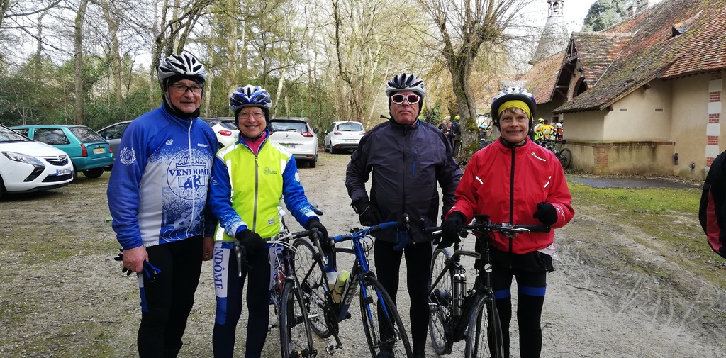 Courageux ou inconscients? Sous une pluie battante nous partons à quatre de Vendôme pour rejoindre la randonnée de Cour-Cheverny. Après tout si la pluie ne cesse pas on boira le café et l'on reviendra. On attend pour décharger les vélos, on va déja prendre la température et nous inscrire. Tout doucement les cyclos arrivent , trois autres Vendômois, pour le VTT ceux-là. A 8h30 la pluie cesse, nous partons. Beaucoup de vent, nous allons jusqu'au Château de Troussay où il y a le ravitaillement. En sortant on se pose la question "que fait-on 40 ou 60 km ?" C'est décidé nous rentrons sur le 40 km, le vent souffle très fort, c'est plus raisonnable.
