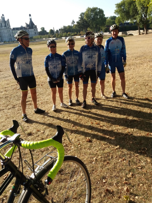 Une petite fraîcheur bien agréable ce matin en partant de Mont Près Chambord pour faire la randonnée. Nous sommes 7 Vendômois. Nous retrouvons beaucoup de connaissances Seniors. Le circuit est particulièrement plat, et très vite nous arrivons devant le château de Chambord. Bien sûr, la photo s'impose. Après le premier ravitaillement, nous nous séparons. Chantal et Joël partent sur le 99, Yolande et Jacky sur le 61 et Brigitte, Momo et moi sur le 79 km. Un deuxième ravitaillement est prévu mais nous nous revoyons qu'à l'arrivée. Bien entendu il a fallut que je crève, c'est une mauvaise année pour moi. La chaleur était revenue et nous roulions bon train vers le vin d'honneur. Bonne matinée. 265 inscrits, où est le temps où il y avait à cette randonnée 5 à 600 personnes. Beaucoup de manifestations prévues ce jour....... M.Jo