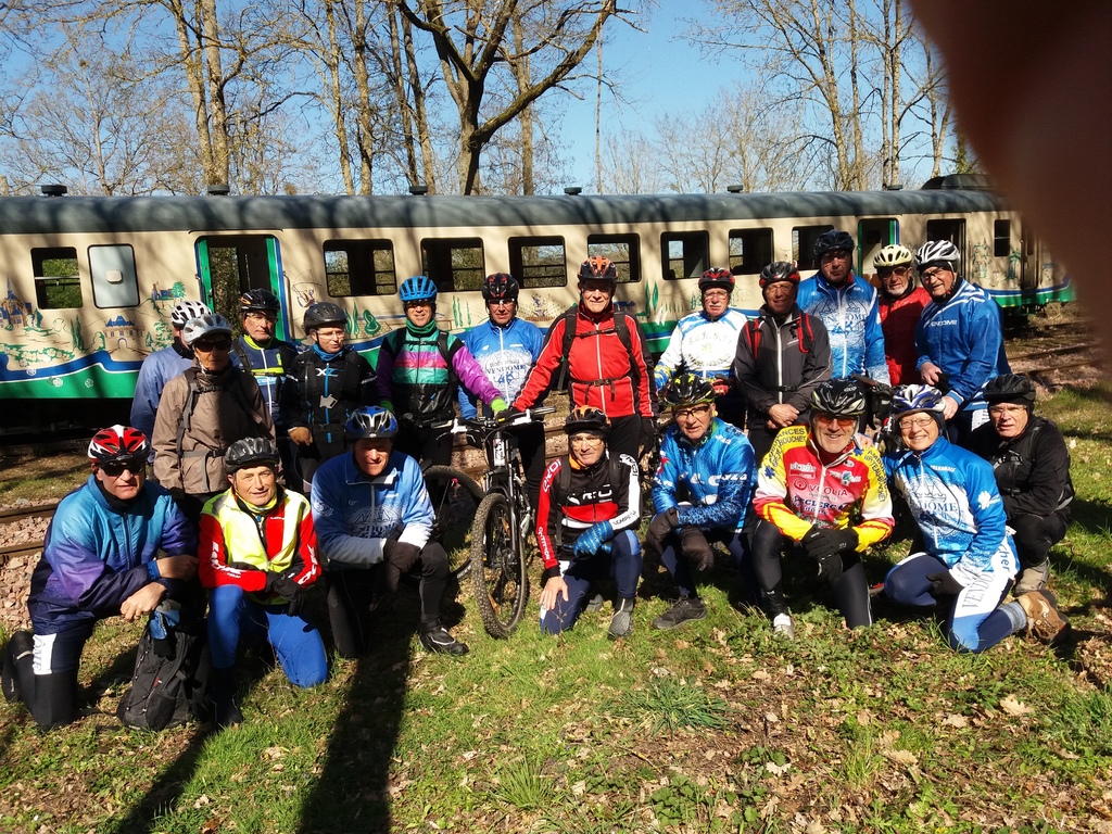 Superbe randonnée ce matin avec un beau ciel bleu, un terrain bien asséché et une équipe de 22 cyclos. Un passage à Thoré où le "petit train" nous attendait pour prendre la photo.