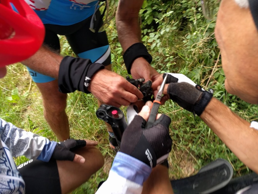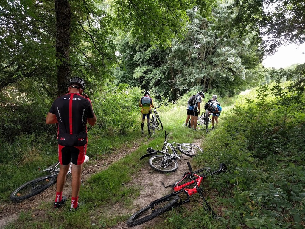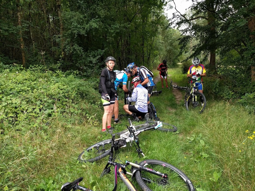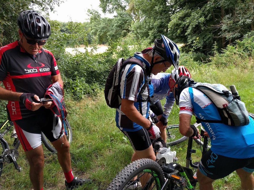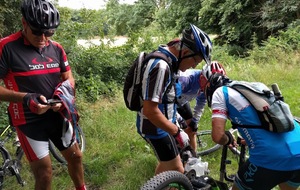 VTT du mardi 30 juin Nous étions 7 ce matin pour un petit tour de VTT que Jacky proposait d’effectuer pour une fois au Nord. Une très belle balade qui à partir de l’Epau nous a fait découvrir de nombreux petits chemins au-dessus de Haie de Champ, Pezou, Lisle avec un retour bord du Loir bien apprécié mais bien venté. Quelques aléas pour pimenter la sortie, une crevaison roue arrière de Michel et notre Jacky qui venant de faire réparer sa roue arrière bloquée sur la sortie du mardi précédent a bloqué cette fois –ci la roue avant. Heureusement nos chefs font suivre la mallette de réparations et ont minutieusement réussi à remettre une agrafe, lui permettant de finir le tour mais sans frein avant : pas évident pour la descente du coteau à Pezou !!!! Avis général des participants : un secteur à retourner explorer….. avec le groupe complet dès que possible….. Et oui, nous réfléchissons à une reprise de nos activités le plus rapidement possible mais sans prendre de risques de recontamination…. Nicole