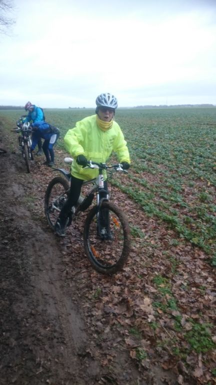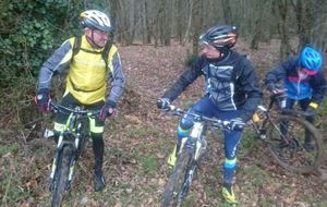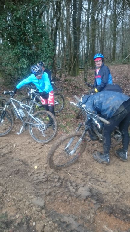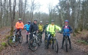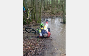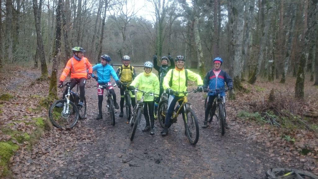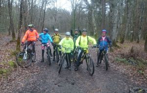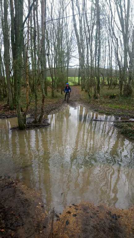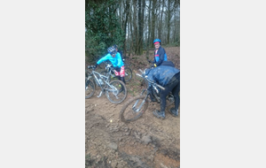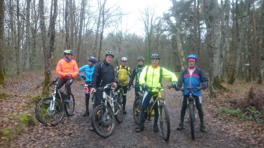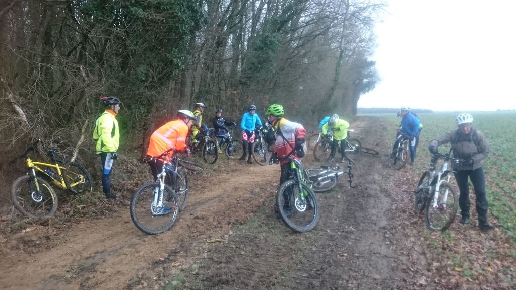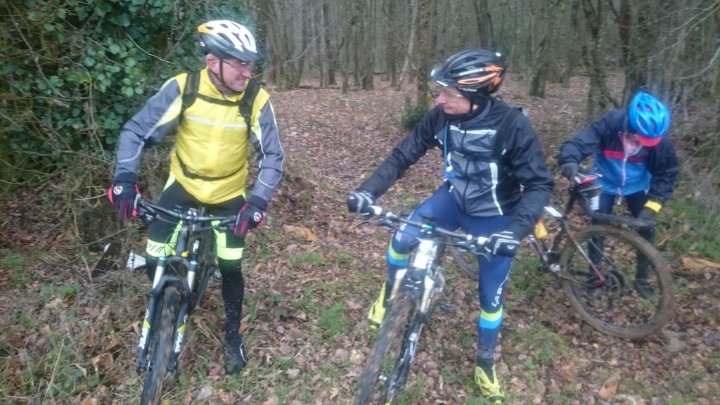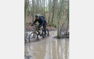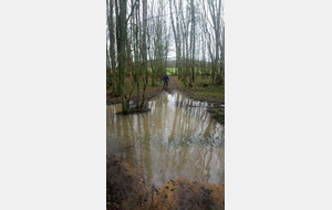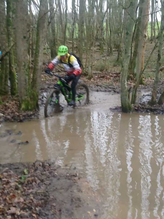 Les chefs décident de repartir par l'Oratoire et de refaire le parcours de la semaine dernière à l'envers. Le terrain est glissant, très humide mais en faisant attention tout va bien. A Rahart nous devons prendre le chemin qui nous conduira à l'Epau : il vient juste d'être terrassé pour le passage de conduite (fibre?? sûrement) . Téméraires, malgré le vent de face, tout le monde ira au bout,en vélo ou à pied... on chasse, on s'enterre, on essaie la bordure du champ; ....on souffle beaucoup à l'arrivée et on débourre nos vélos qui ne peuvent presque plus rouler! Le dérailleur de Didier n'a pas supporté , il repart à pied et 5 d'entre nous, craignant pour la suite, choisissent de rentrer. Nous atteignons le bois et arrivons au gué qu'il faut prendre cette fois à l'envers , le niveau d'eau a monté mais nous nous élançons et ça passe plutôt bien sauf pour quelques uns qui s'enfonceront les pieds dans la boue ou un peu dans l'eau et pour Jean-Louis qui victime d'un coup de guidon se prend une branche et tombe à l'eau. Grosse rigolade (sauf pour lui..) Nos vélos ont apprécié, ça les a grossièrement nettoyés. Nous remontons le bois et nous dirigeons vers St Ouen, sur le plateau, 5 Ondoniens choisissent de rentrer en direct. Nous ne sommes plus que 8; le passage de la grande ravine de la Jousselinière se fait bien mais la grosse remontée , vent de face est très boueuse, glissante et éprouvante ... Ouf , nous regagnons le bois de l'Oratoire que nous traversons et arrivons à Courtiras à 12h05 très contents de nous. Il était temps : la pluie arrive!