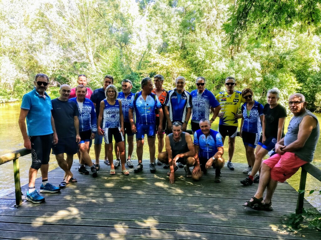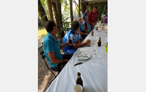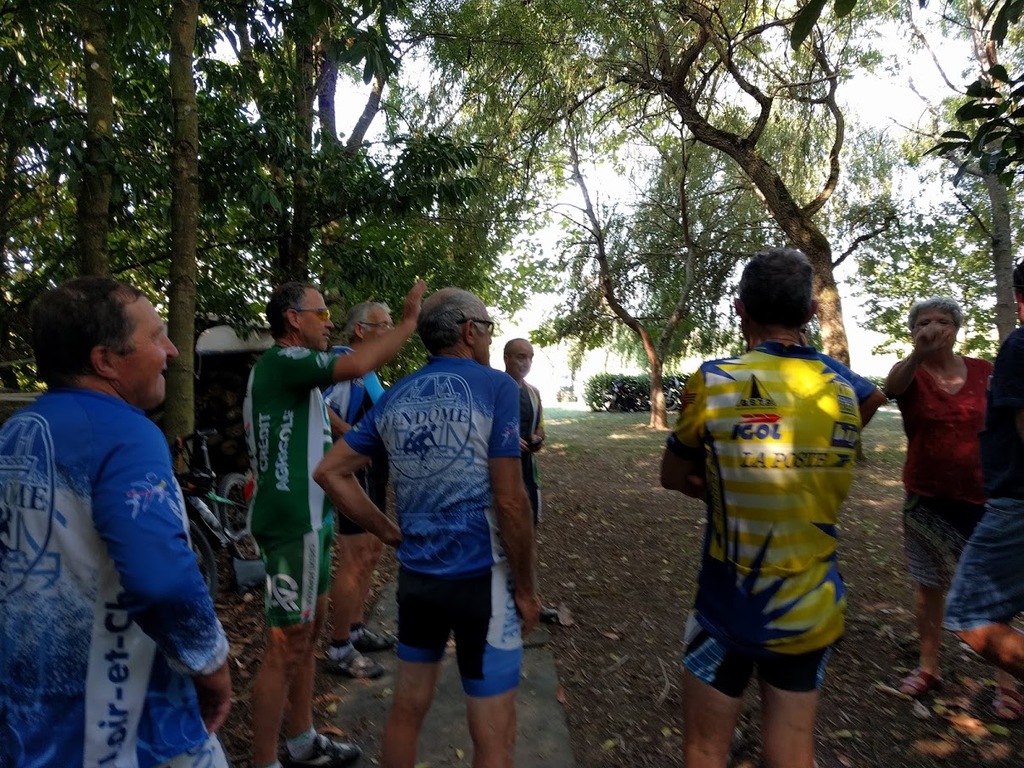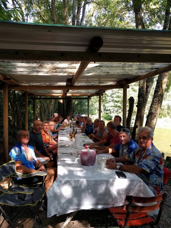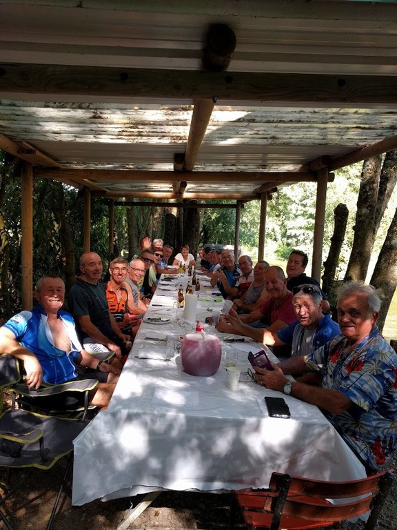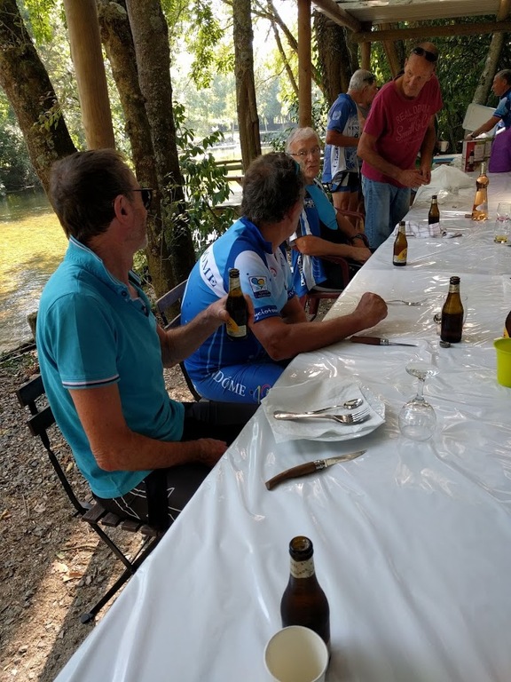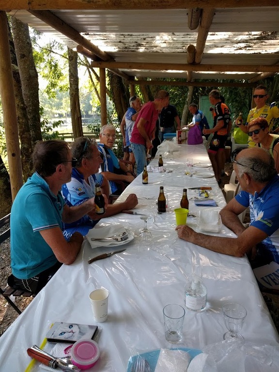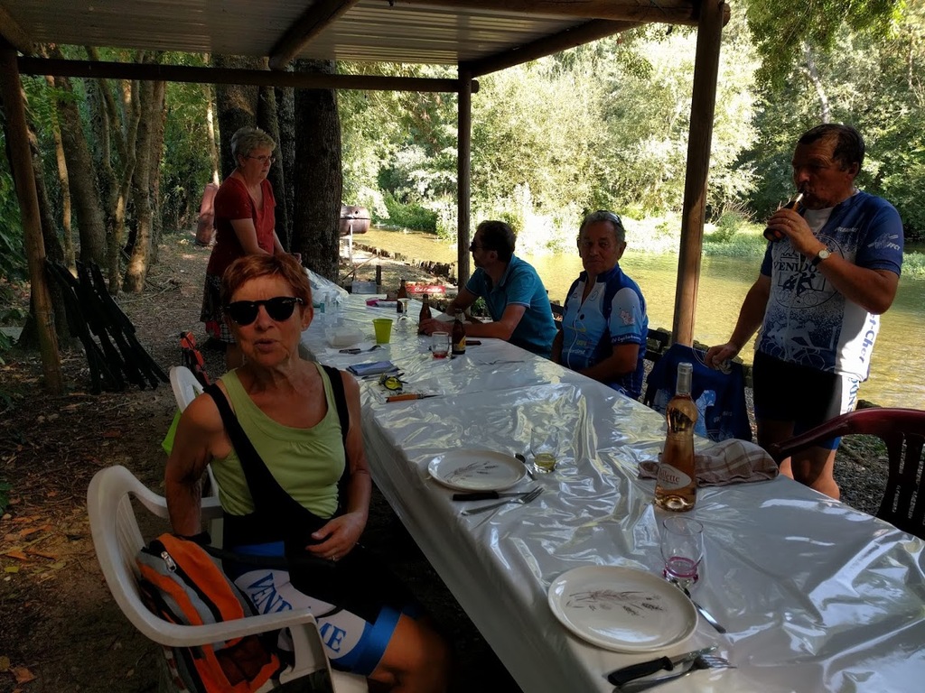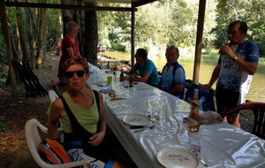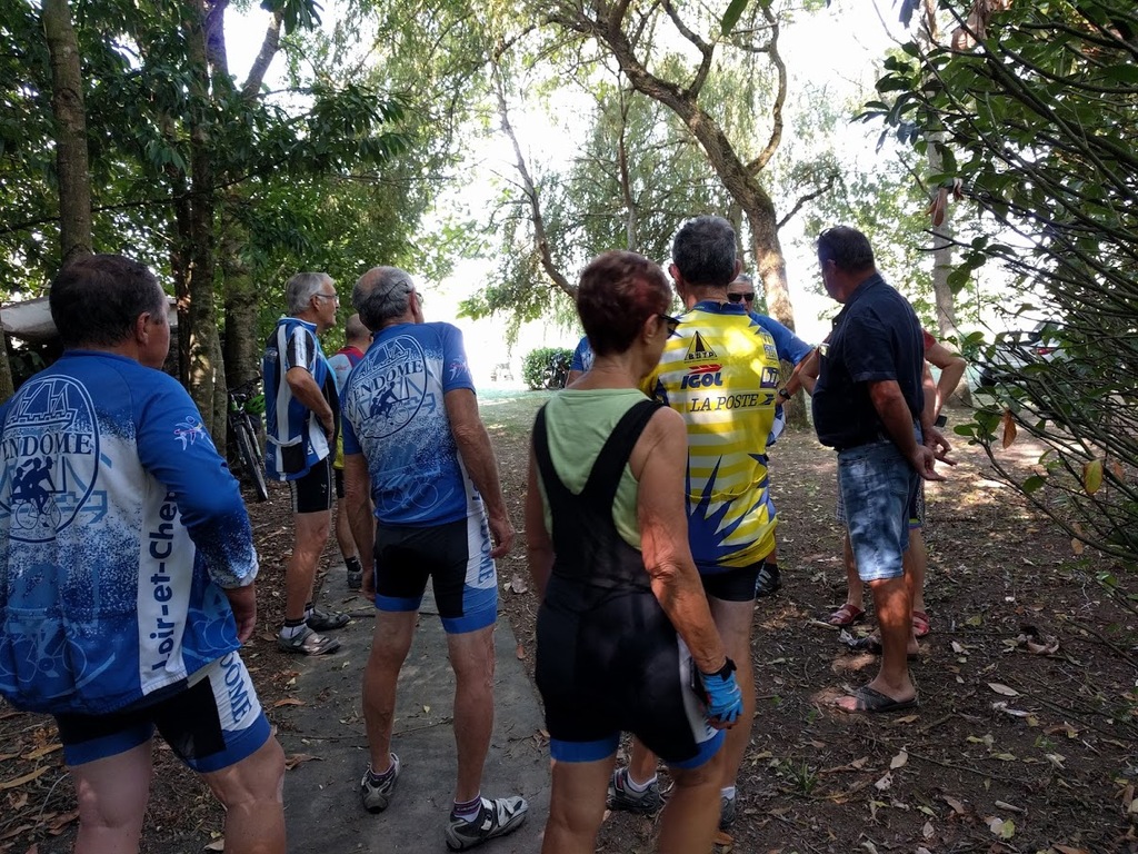 Quel beau peloton. Nous prenons les allées du château de Meslay. Il y a de quoi faire et notre responsable connaît le parc. Nous ressortons à la Grapperie et prenons le chemin qui nous mène à la chapelle Saint-Vrain. De là nous traversons beaucoup de sous-bois, ce qui nous convient car la chaleur arrive. Nous faisons la grande boucle du circuit de la randonnée de Saint-Ouen. 41Km à l'arrivée au terrain. Nous préparons les tables et attendons l'apéritif, la bernache, que Jean-Marie doit amener. Voilà tout est en place, une belle tablée de 24 personnes. Quel paisible moment, près du Loir qui serpente aux pieds de grands arbres qui nous donnent de l'ombre. Michel nous a commandé des plateaux repas, très bien garnis, nous sommes affamés. Il règne une bonne ambiance, les rires fusent, les bêtises aussi. A la fin du repas, nous ne sommes pas pressés de nous quitter. Notre Daniel, Pépére, veut apprendre à pêcher, d'autres, iraient bien se baigner, ou, tout du moins, se mouiller les pieds car le Loir est très bas.