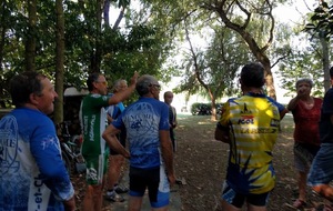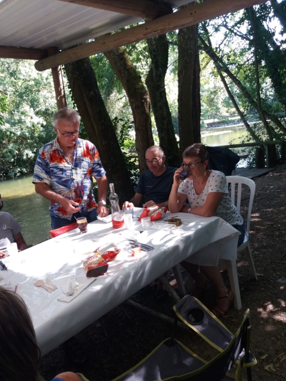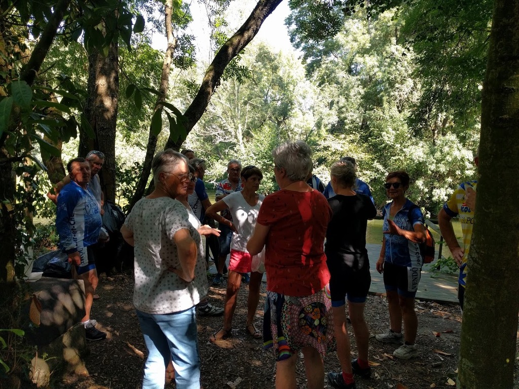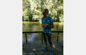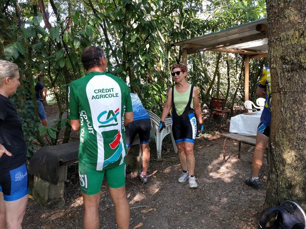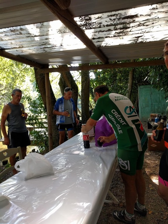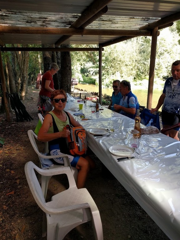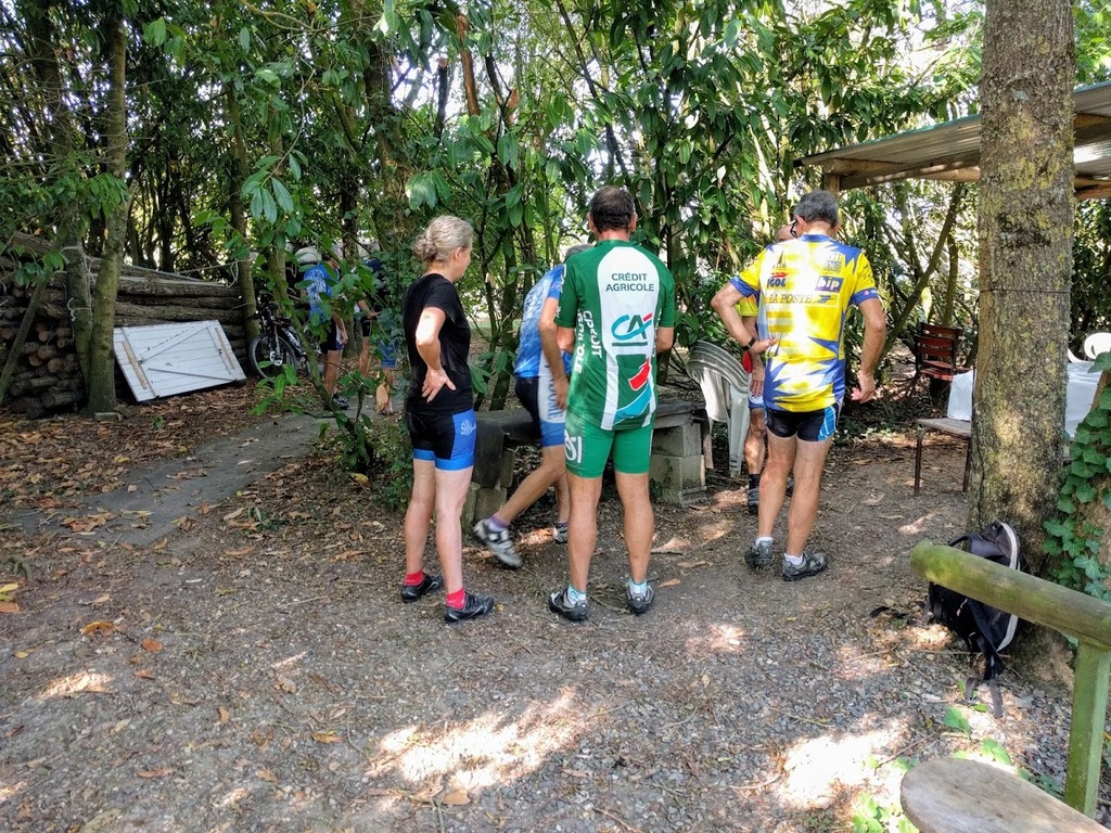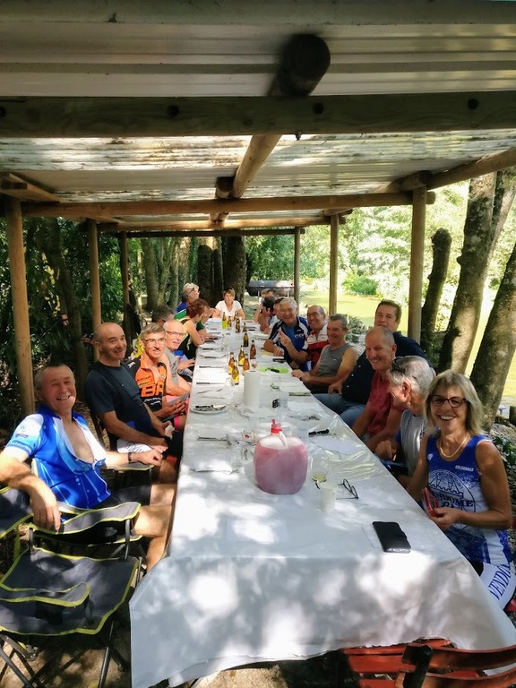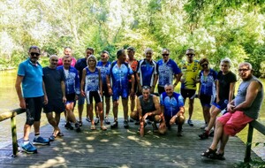 Quel beau peloton. Nous prenons les allées du château de Meslay. Il y a de quoi faire et notre responsable connaît le parc. Nous ressortons à la Grapperie et prenons le chemin qui nous mène à la chapelle Saint-Vrain. De là nous traversons beaucoup de sous-bois, ce qui nous convient car la chaleur arrive. Nous faisons la grande boucle du circuit de la randonnée de Saint-Ouen. 41Km à l'arrivée au terrain. Nous préparons les tables et attendons l'apéritif, la bernache, que Jean-Marie doit amener. Voilà tout est en place, une belle tablée de 24 personnes. Quel paisible moment, près du Loir qui serpente aux pieds de grands arbres qui nous donnent de l'ombre. Michel nous a commandé des plateaux repas, très bien garnis, nous sommes affamés. Il règne une bonne ambiance, les rires fusent, les bêtises aussi. A la fin du repas, nous ne sommes pas pressés de nous quitter. Notre Daniel, Pépére, veut apprendre à pêcher, d'autres, iraient bien se baigner, ou, tout du moins, se mouiller les pieds car le Loir est très bas.