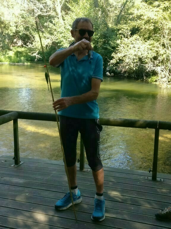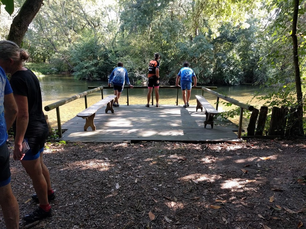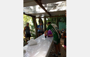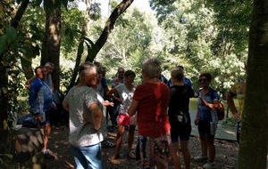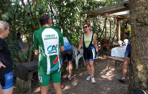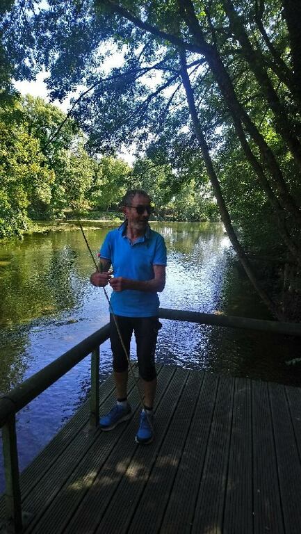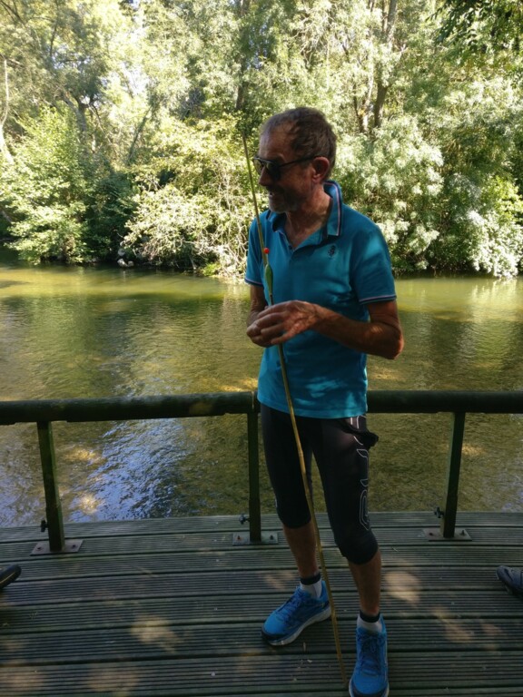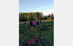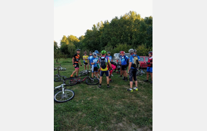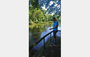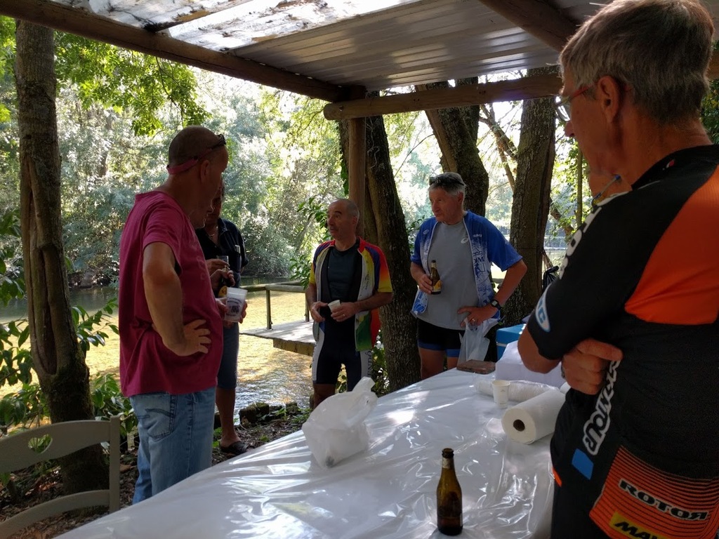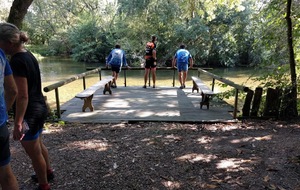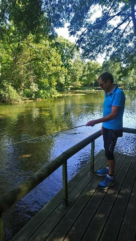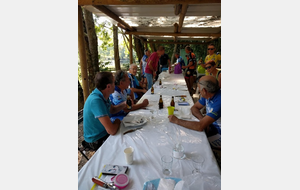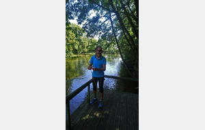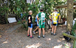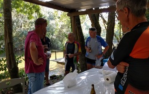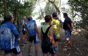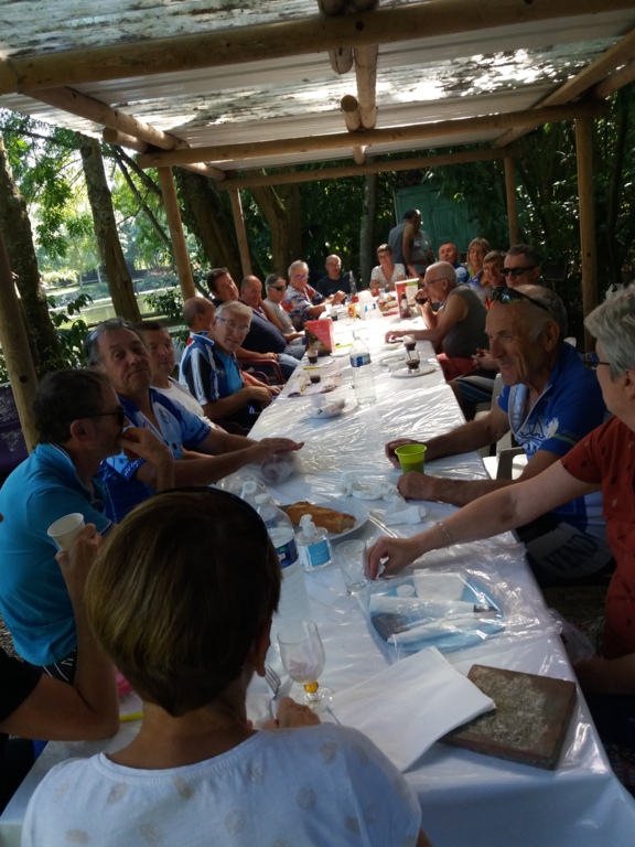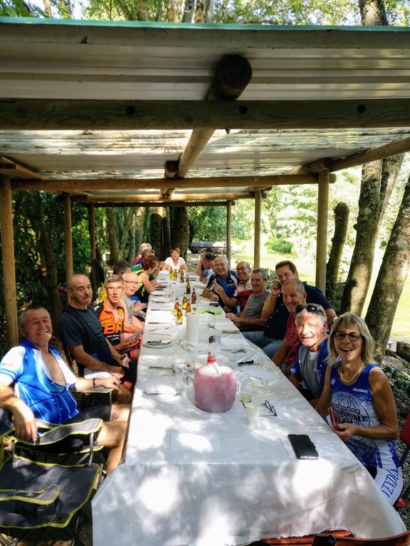 Quel beau peloton. Nous prenons les allées du château de Meslay. Il y a de quoi faire et notre responsable connaît le parc. Nous ressortons à la Grapperie et prenons le chemin qui nous mène à la chapelle Saint-Vrain. De là nous traversons beaucoup de sous-bois, ce qui nous convient car la chaleur arrive. Nous faisons la grande boucle du circuit de la randonnée de Saint-Ouen. 41Km à l'arrivée au terrain. Nous préparons les tables et attendons l'apéritif, la bernache, que Jean-Marie doit amener. Voilà tout est en place, une belle tablée de 24 personnes. Quel paisible moment, près du Loir qui serpente aux pieds de grands arbres qui nous donnent de l'ombre. Michel nous a commandé des plateaux repas, très bien garnis, nous sommes affamés. Il règne une bonne ambiance, les rires fusent, les bêtises aussi. A la fin du repas, nous ne sommes pas pressés de nous quitter. Notre Daniel, Pépére, veut apprendre à pêcher, d'autres, iraient bien se baigner, ou, tout du moins, se mouiller les pieds car le Loir est très bas.
