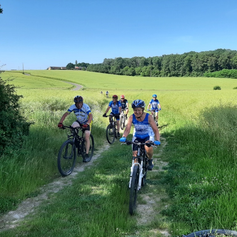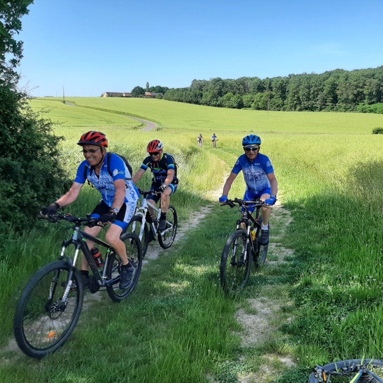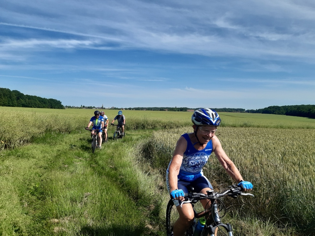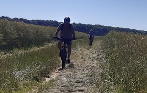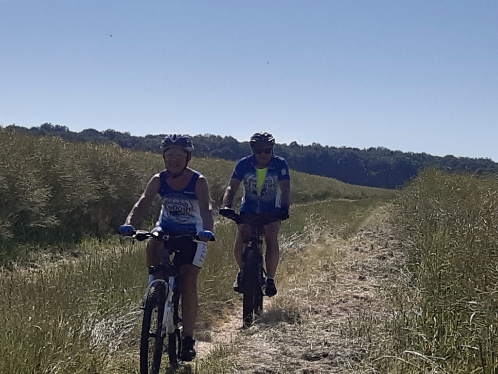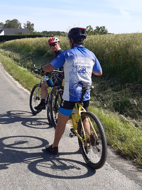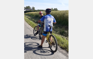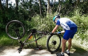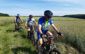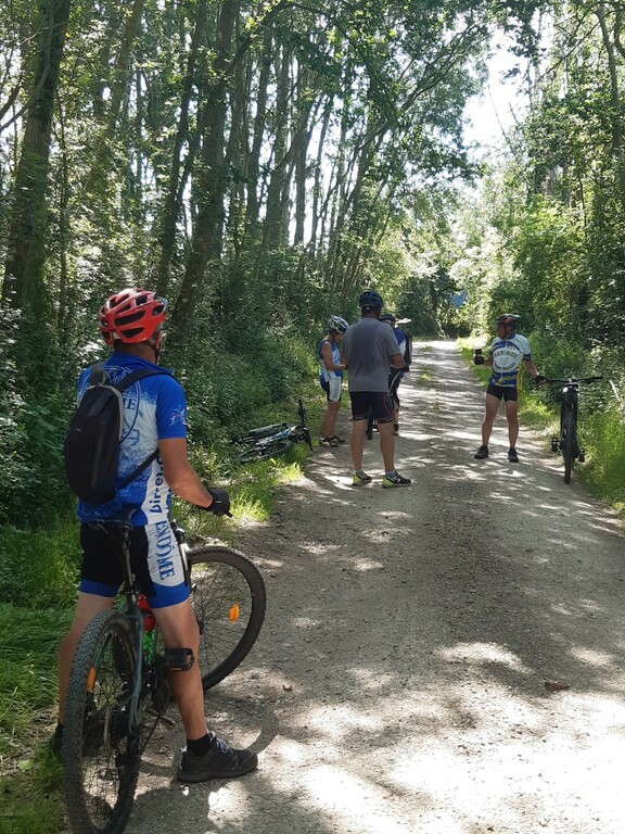 Belle randonnée ce matin mardi 15 juin, nous avons un temps formidable et une bonne équipe de 10 personnes.. Pourtant nous avons eu beaucoup d'imprévisibles.Une crevaison au départ nous fera démarrer légèrement plus tard, ensuite nous perdons Bernard dès la première montée dans la forêt , nous faisons demi-tour et les portables fonctionnent. Une fois retrouvé, nous roulons enfin normalement. Nous empruntons des sentiers très herbeux et pas très carrossables si bien que nous déplorons deux chutes, sans importance bien sûr, plutôt risibles. Sur le retour encore une crevaison, le sort s'acharne contre nous mais après tout, nous avons le temps et ce ne sont que des colibets à l'encontre de celui qui a crevé. Très bonne matinée dans la bonne humeur. M.Jo