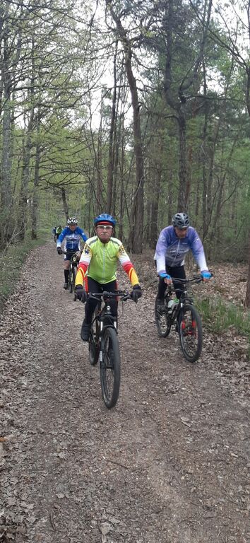Encore une belle équipe de VTT ce matin pour la reconnaissance des circuits du 18/19 juin. Nous étions 17 à démarrer vers Naveil soi-disant pour aller au plus court et partir des Grands-Prés. Nous longeons le Loir et grimpons sur le côteau pour redescendre sur le tertre de La motte. Nous allons vers Areines pour prendre un petit chemin qui suit la Houzée jusqu'à Tournebride et là nous grimpons dans la forêt d'Huchigny et ça n'en finit pas de grimper, Périgny, Selommes, retour de l'autre côté de la déviation pour redescendre par le château, plus de 40 km, bien pentus mais toujours dans la bonne humeur. Une petite frayeur notre "Pinpin" qui a voulu remonter une ornière, s'est envoyé en l'air, en beauté. Pas de casse j'espère. Marie-Jo