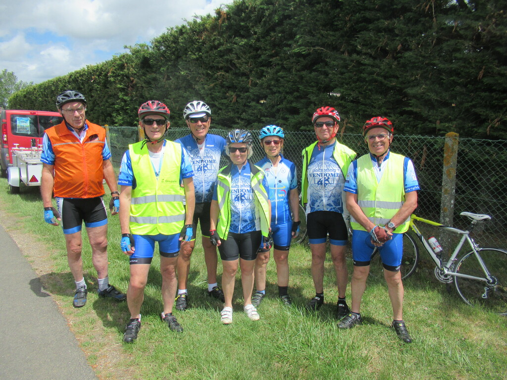 Aujourd'hui jeudi 9 juin le club avait accepté de participer à la rencontre de l'UNAFAM. Nous étions une petite équipe de 7 personnes. Une trentaine de cyclos venait de Tours faisait une halte à Vendôme pour rejoindre ensuite Paris, un périple de 1300 km. Chose inhabituelle tous ces cyclos sont handicapés mentaux. Certains n'ont jamais roulé mais le but est de briser les tabous et de changer le regard des autres sur ces gens. Nous les attendions à Ambloy et les applaudissons à leur arrivée. Ils étaient fiers de monter la petite côte et d'avoir fait tout ce trajet. Une petite collation les attendait et nous repartons sur Vendôme. Nous formons trois groupes et sommes surpris par leur plaisir à pédaler. Quelques discussions s'engagent entre nous et les encadrants, ils sont ravis de nous avoir à leurs côtés. Nous faisons une petite halte au parking du golf juste pour se regrouper pour l'arrivée à Vendôme. Joël fait la circulation pour traverser au mieux la ville. A l'arrivée, un concert de musique entraînante et de bravos pour nous féliciter, surtout eux. Ils sont heureux, certains posent leur vélo et se mettent à danser, même pas fatigués. Quelques discours des représentants des associations et de Monsieur le Maire et nous partageons le verre de l'amitié. Les encadrants et quelques "malades" nous remercient chaleureusement pour notre accompagnement, c'est touchant et nous ne regrettons pas notre action. M.Jo