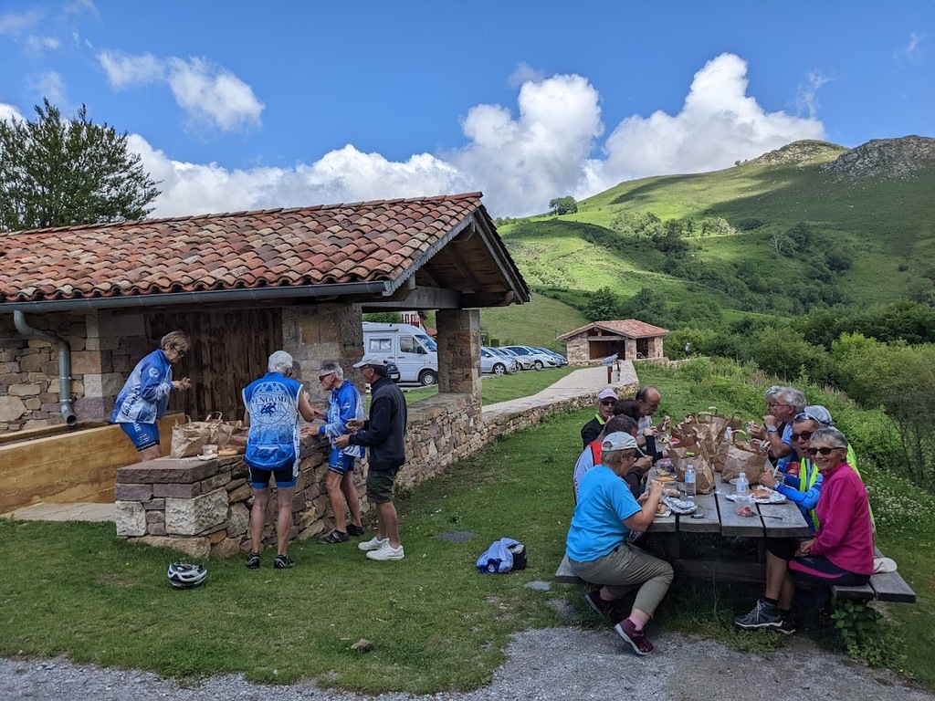 Nous repartons sereins , toujours sur de petites routes et entamons enfin le dernier col, les 9km paraîtront un peu long pour Pinpin mais nous arrivons au refuge à 12h40 très fiers de nous.et retrouvons les marcheurs et le premier groupe dont 6 ont abandonné le vélo à Sarre et sont montés en voiture, tous étonnés de nous voir arriver par cette direction... et peinant à croire que nous avions fait le vrai parcours! Une bonne sangria au bar sera la bienvenue et surtout le pique nique car nous avons bien faim.