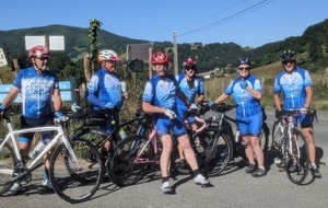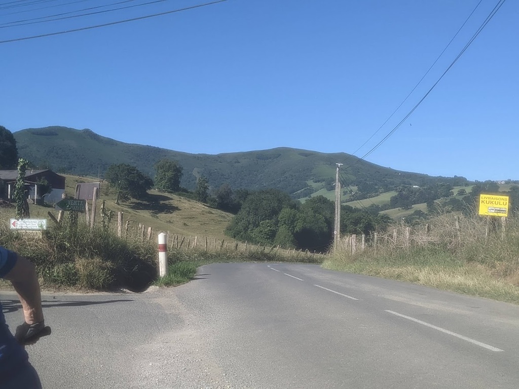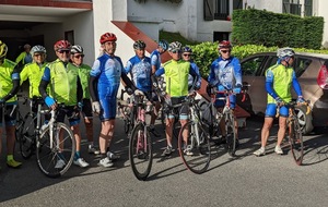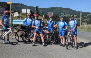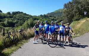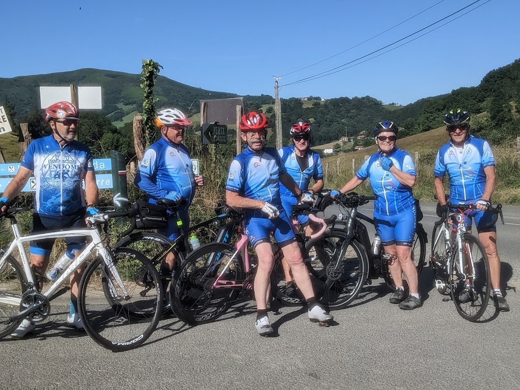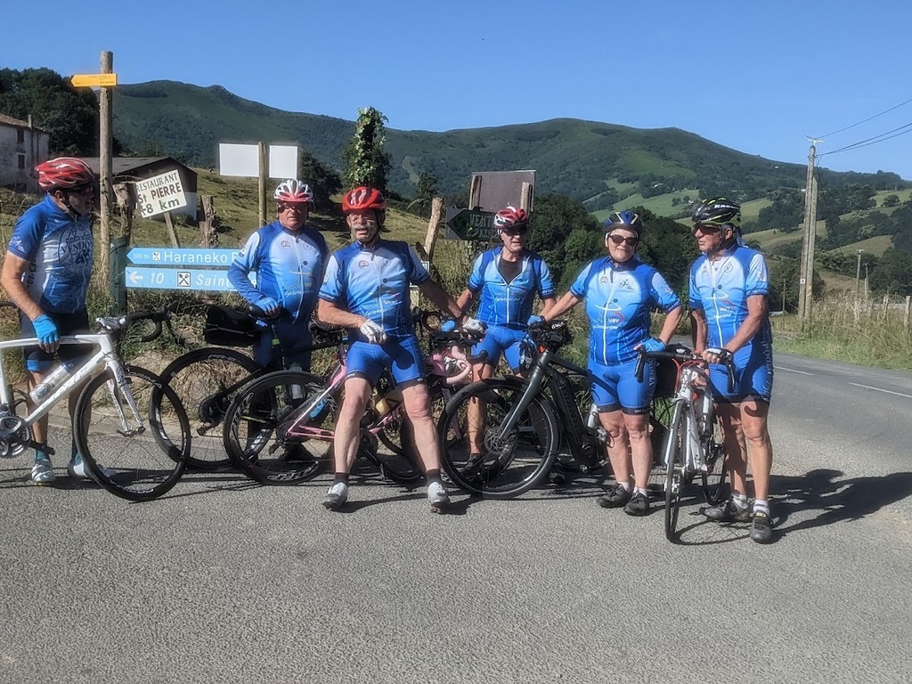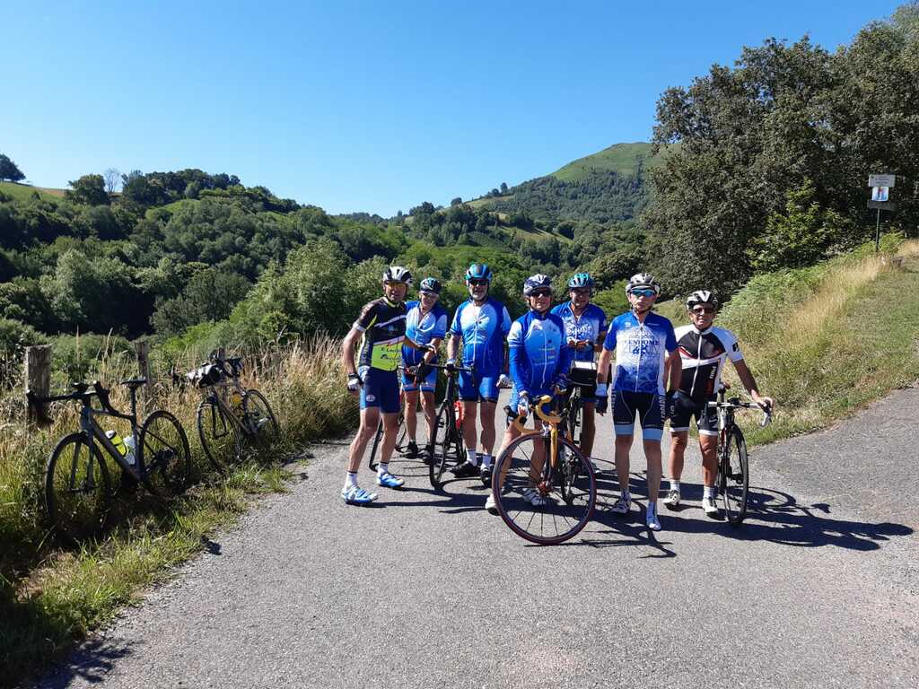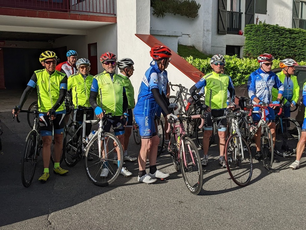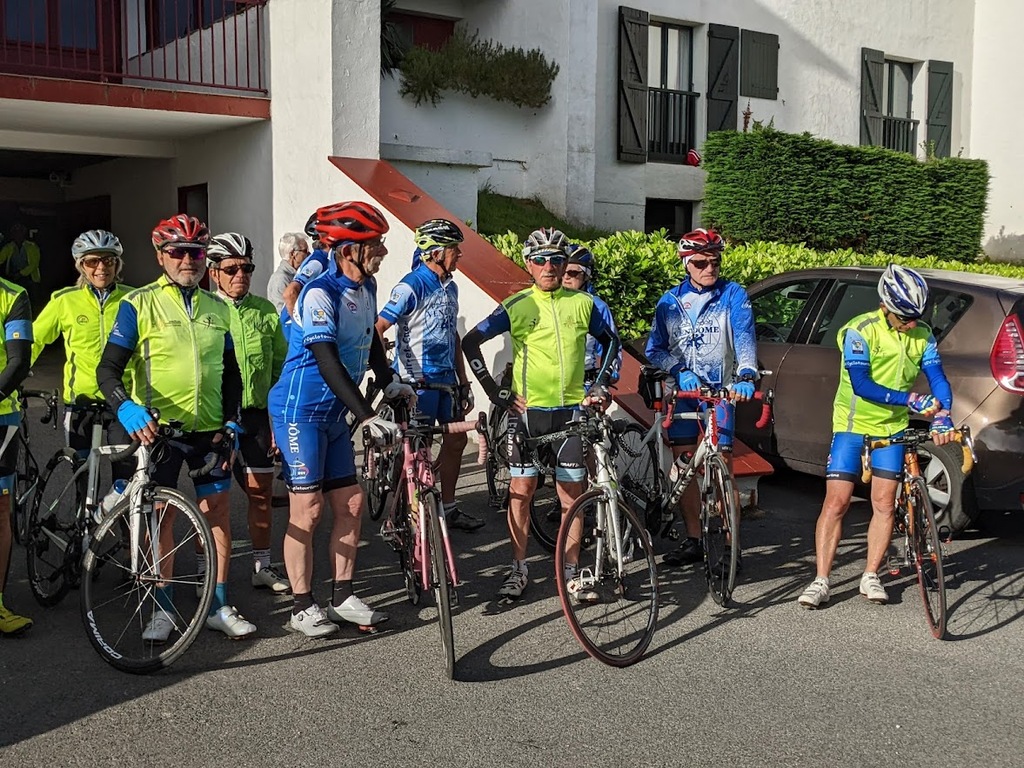La journée d'hier a laissé des traces, nous n'étions que 15 ce matin prêts pour une sortie à gros dénivelés. Un groupe de 8 part devant et fera presque le tour complet avec des dénivelés répétitifs de 10 à 20% , des paysages grandioses dans le Pas De Roland mais fera l'impasse sur le dernier col (les jambes de Jacky S sont à bout de force..) avec quand même 72km et 1100m de dénivelé...Notre groupe de 7 part tranquille et roule jusqu'à Itxassou ; 30km sur une succession de petites bosses et préfère rejoindre le parcours au point de retour à Espelette avec un bon petit col de quelques km mais très pentu ; un bon passage à 14% mais la descente sera un pur bonheur...50km à l'arrivée et 660m de dénivelé. Parcours exigeants mais de l'avis de tous les rouleurs : les plus beaux paysages depuis le début de semaine et surtout un ciel magnifique et le retour de la chaleur. Après-midi visite ou marche pour tout le monde et on se retrouve pour un apéro- sangria bien bruyant pour l'anniversaire de Cécile suivi d'une belle surprise. en arrivant au repas : nous comptions sur une soupe à l'oignon, une escalope forestière et nous trouvons une belle table décorée avec l'énoncé du menu festif , sangria et petits fours, foie gras et compotée aigre-douce de mangue, filet mignon de veau aux cèpes et tagliatelles à l'encre de seiche, assiette de fromages du terroir et croquant poire-praliné...et bien sûr une bougie pour Cécile ; les dénivelés feront sûrement mal aux jambes demain .... mais quelle belle journée nous avons eue....