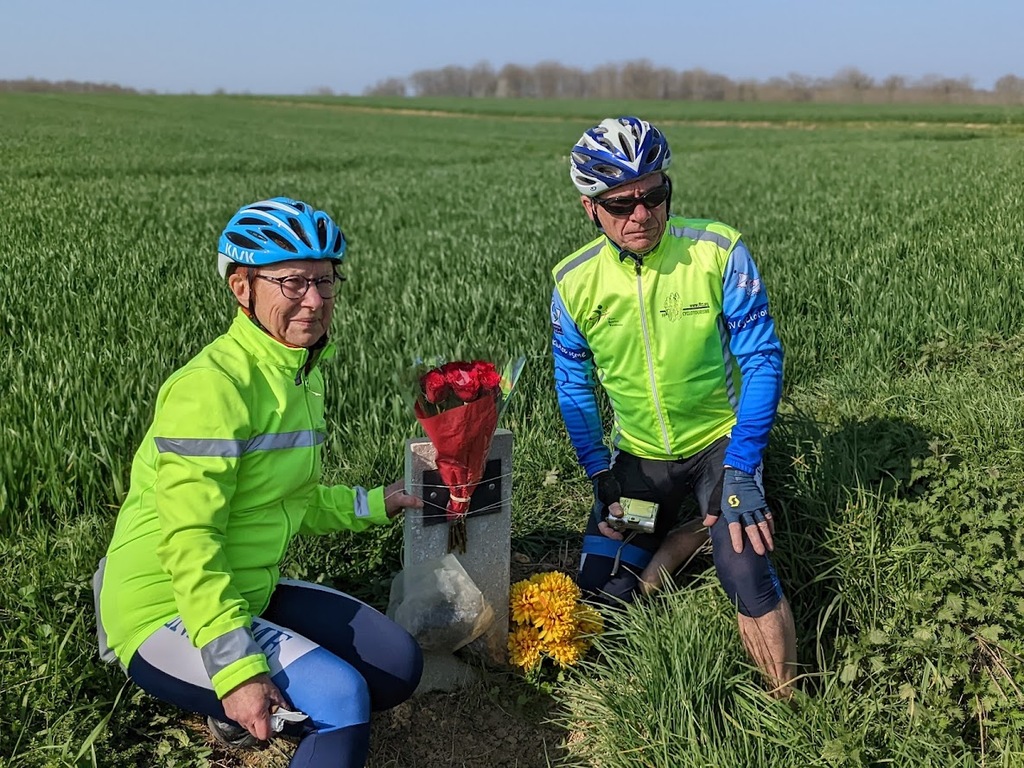 Que le temps passe vite, vingt ans cette année que Yannick nous quittait brutalement sur ce parcours en compagnie de Gilbert. Nous étions 21 pour cette vingtième édition sous le soleil printanier mais avec un vent d’Est rafraichissant bien la température. Un bon groupe divisé en deux pour la sécurité avec une allure réduite par le vent sur la première partie nous permettait de papoter tranquillement. A l’arrêt, pour déposer le bouquet de roses et se recueillir devant la stèle, le soleil nous a bien réchauffés et nous étions détendus pour repartir. Mais après une bonne pointe de vitesse dans la descente vers St Hilaire nous voilà immobilisés devant le passage à niveau fermé et grillagé pour travaux. Nous pensions pourtant bien qu’un passage serait accessible mais il a fallu se rendre à l’évidence et s’infiltrer quelques mètres sur le côté pour enjamber avec nos vélos la voie ferrée de façon un peu périlleuse mais avec une bonne rigolade. Heureusement le sol était bien sec… Le retour vent dans le dos était bien agréable et nous nous sommes quittés satisfaits de cet hommage à Yannick , avec nos pensées pour Gilbert . Nicole