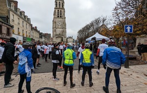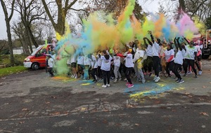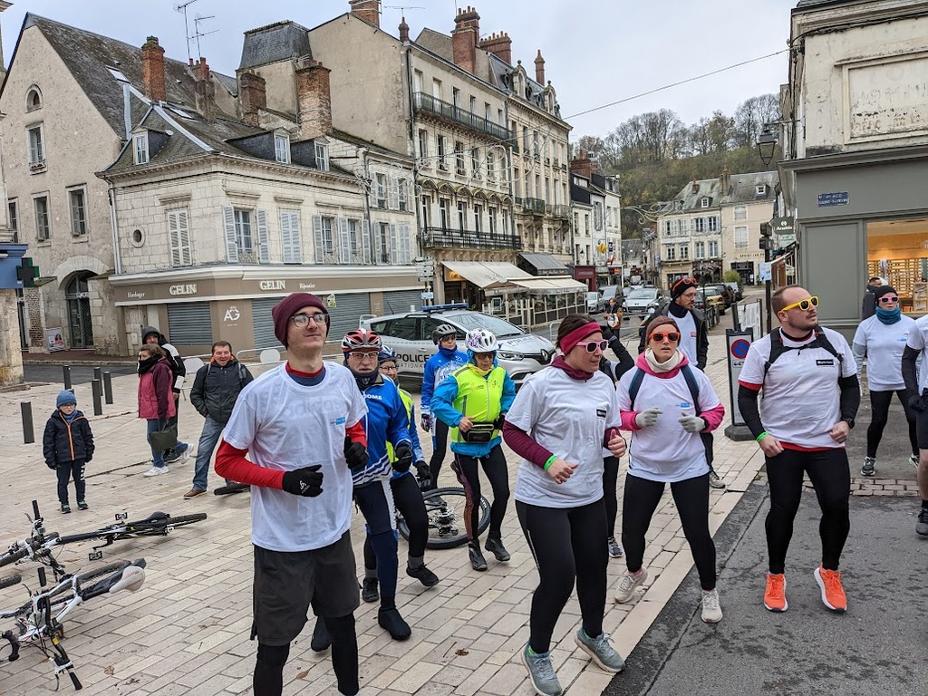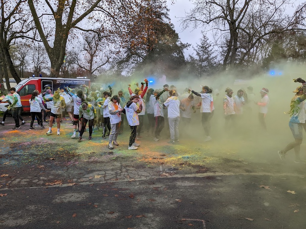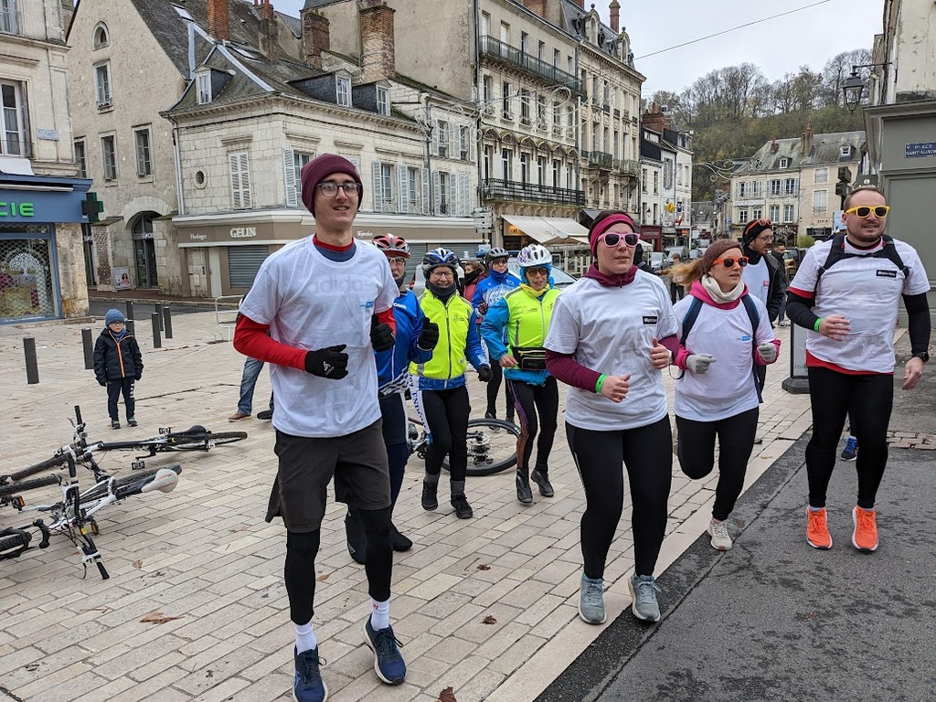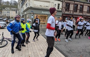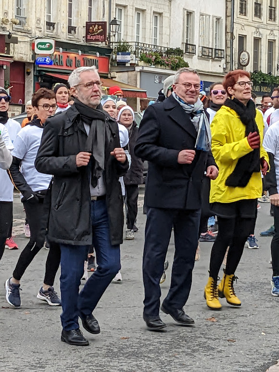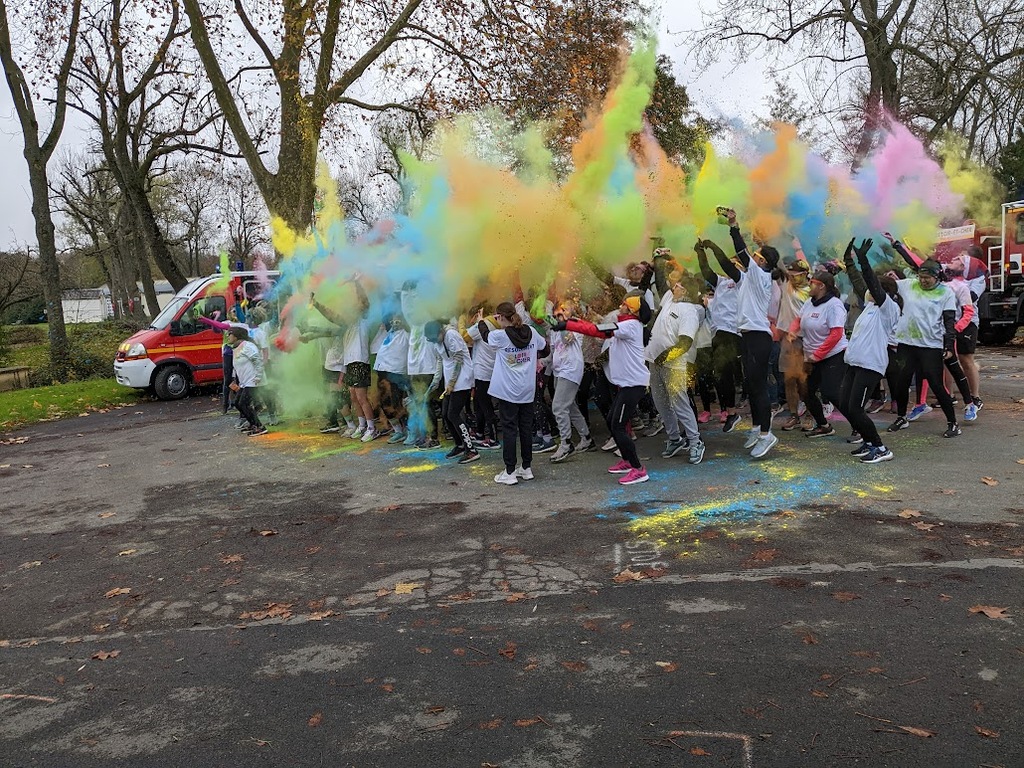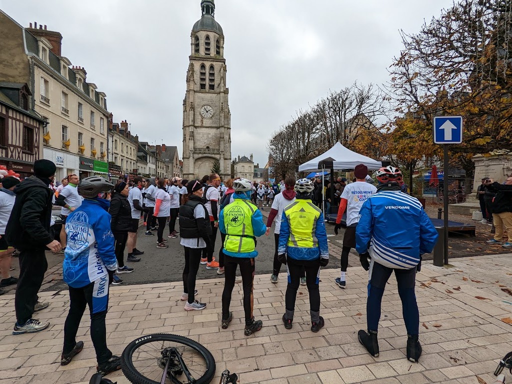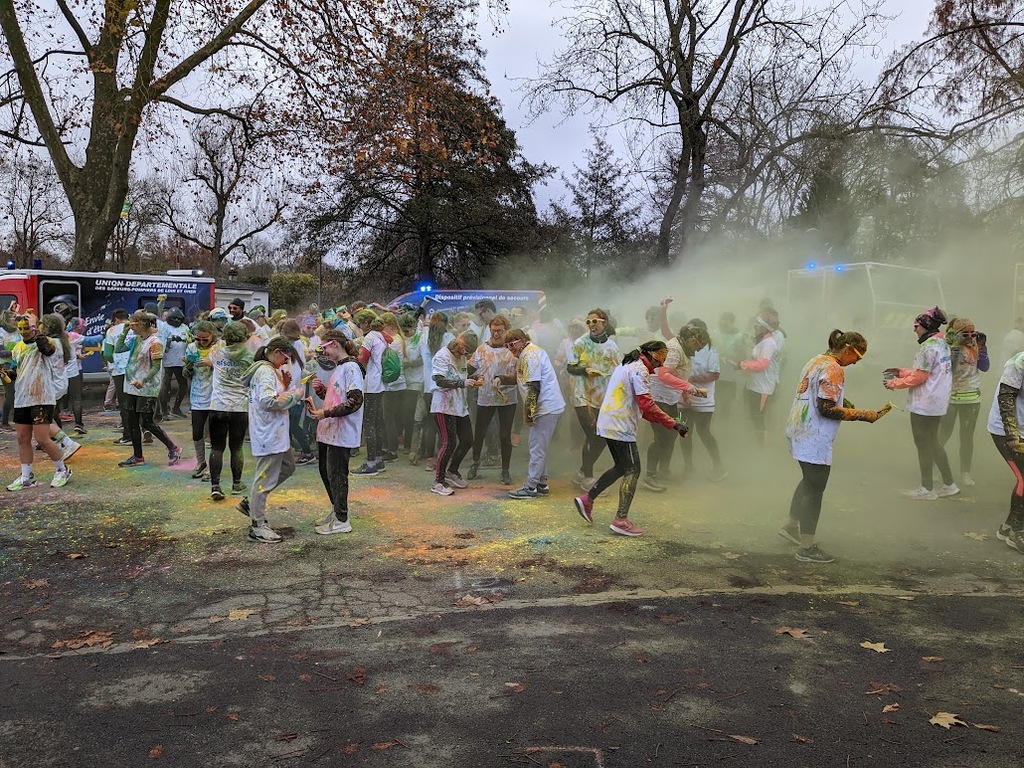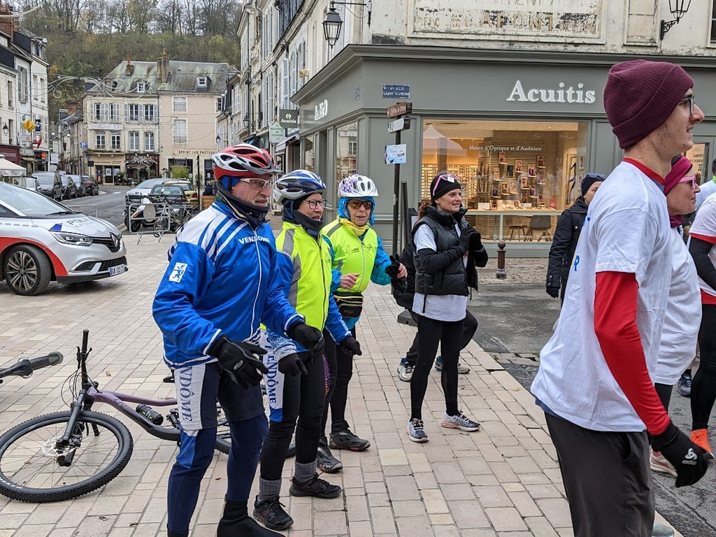 Nous étions 6 dont 4 féminines ! 5 pour encadrer la course en vélo et Isabelle comme signaleur carrefour; il fait froid mais on se réchauffe sur la ligne de départ Place St Martin, avec un échauffement commun rythmé par un coach , une course bien sympathique, sans enjeu si ce n'est celle de s'amuser et d'être courtois avec les automobilistes et les piétons, des jets de poudre colorée sur les coureurs à intervalles réguliers et en final au Grands Prés après l'arrivée des derniers coureurs une immense envolée de poudre par tous les participants. Un bon moment festif que nous avons terminé sous le marché couvert avec un excellent vin chaud. Nicole.
