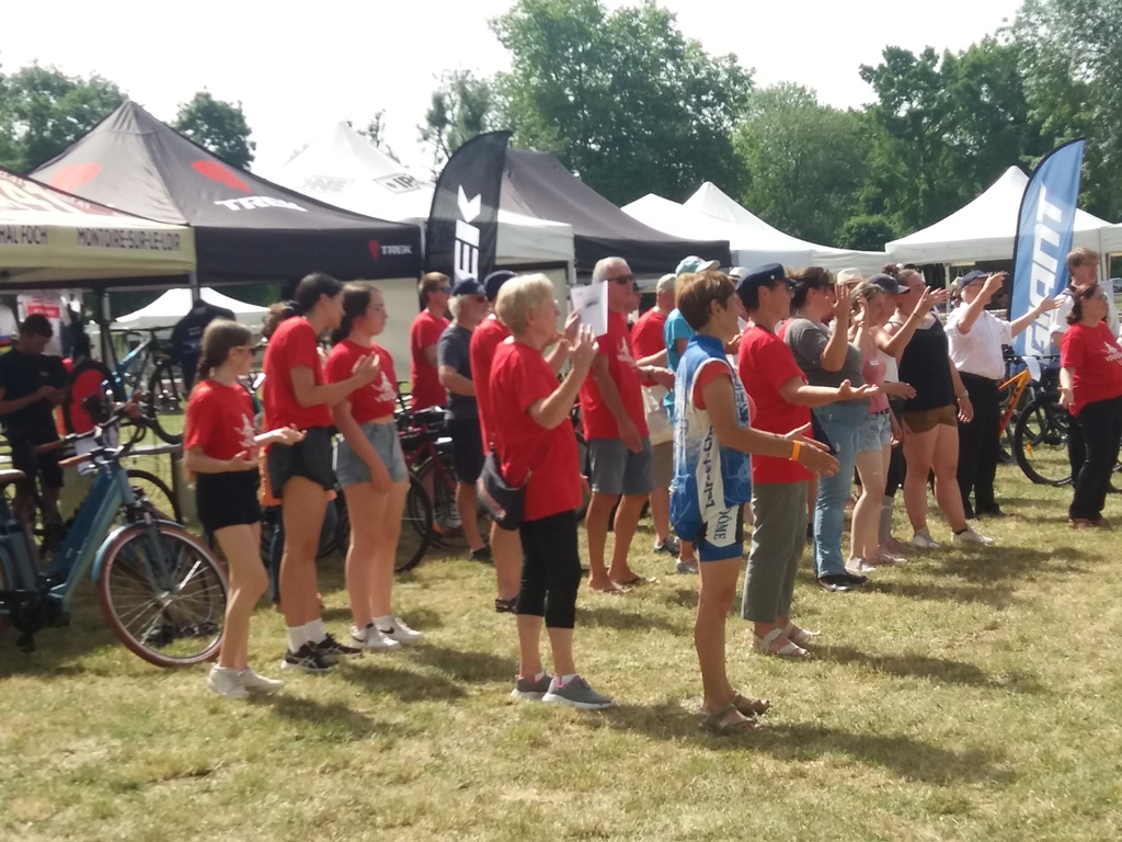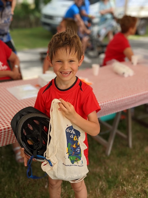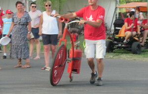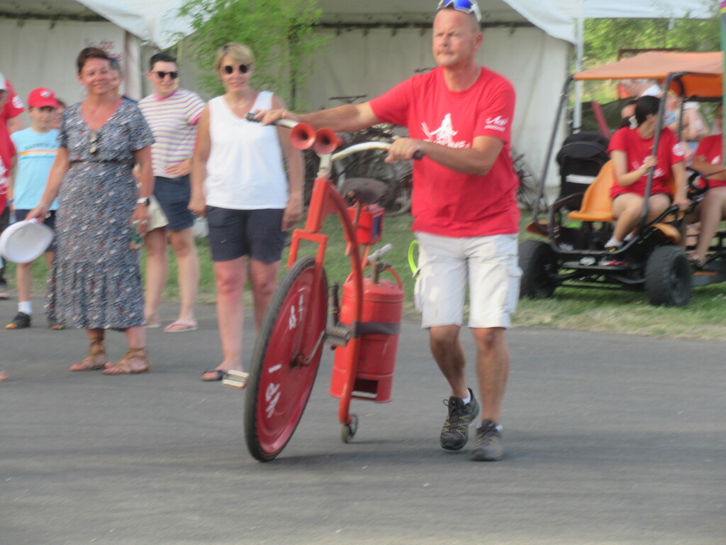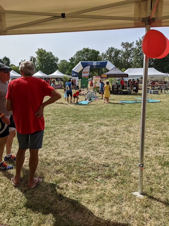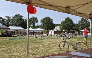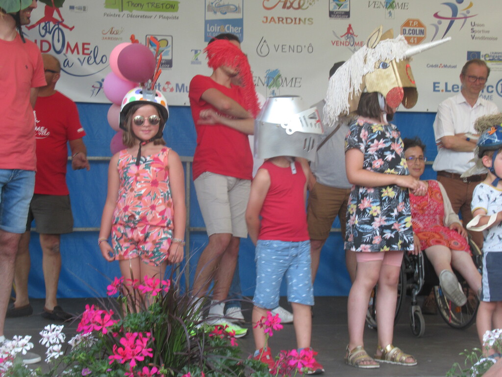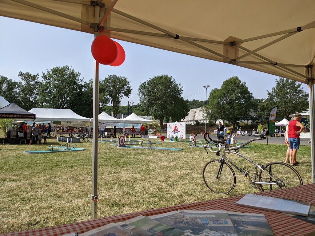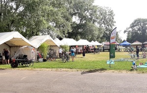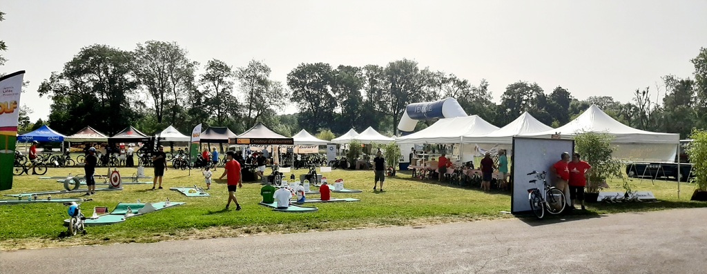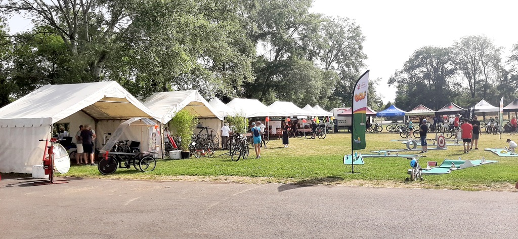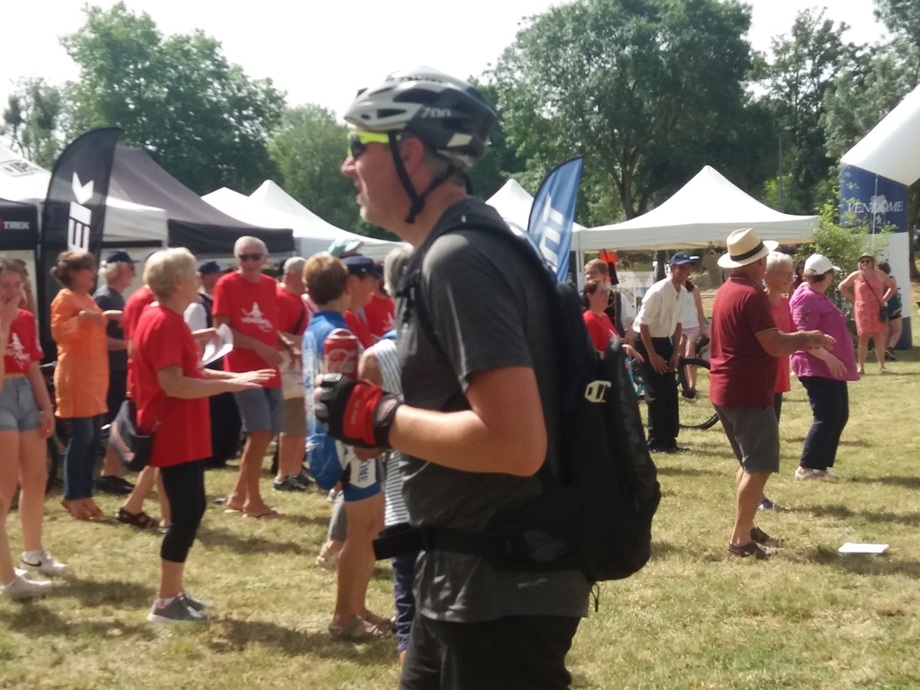 Avec la montée en puissance du thermomètre, vers 13h ; il restait peu de flâneurs, chacun étant rentré chercher un peu de fraîcheur à domicile . Seuls les exposants, bénévoles d'animation et organisation déjeunaient sur place en limitant au maximum les efforts. En cours d'après-midi quelques visiteurs courageux déambulaient tranquillement sur l'espace d'animation et s'intéressaient aux parcours du lendemain; la plupart étaient déçus de l'annulation du défilé ; de la chaleur les ayant contraints à ne pas rouler sur les parcours et espéraient bien se rattrapper dimanche ; nous tenant gentiment occuppés jusqu'à l'heure des remises de prix des concours de casques et vélos qui clôturait cette bonne journée.