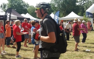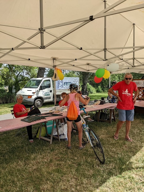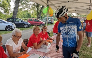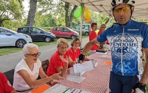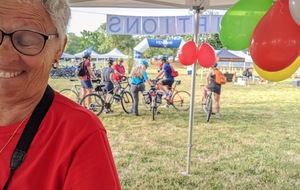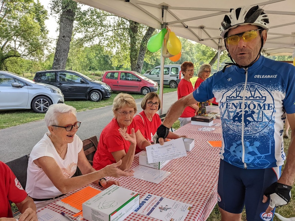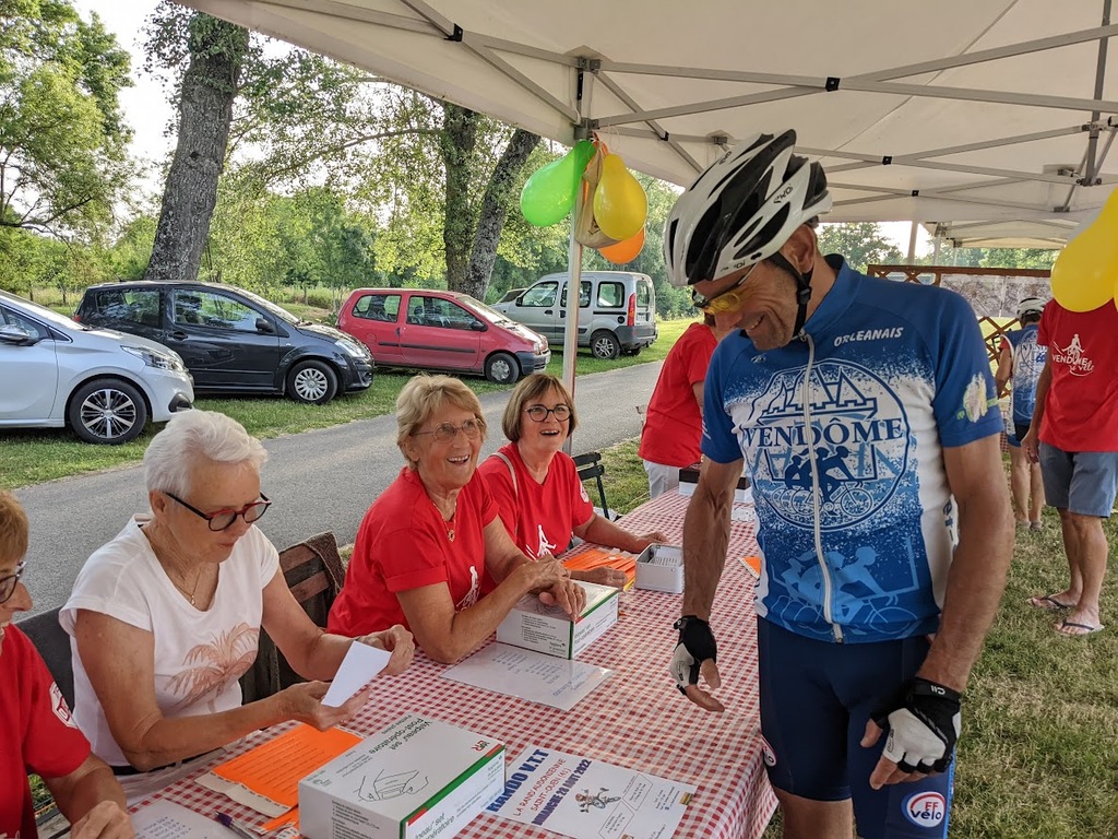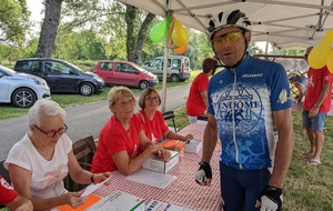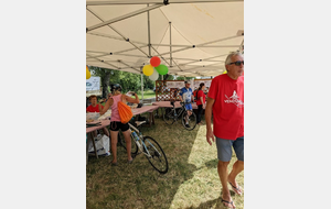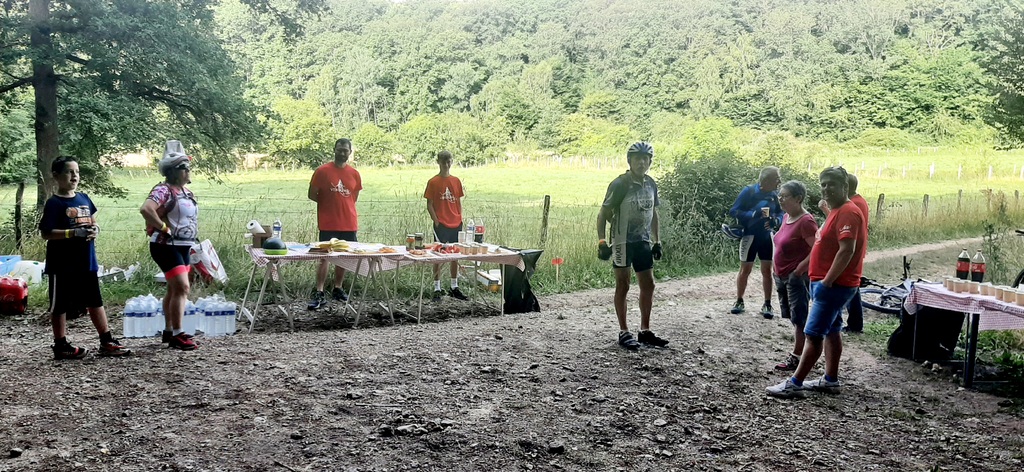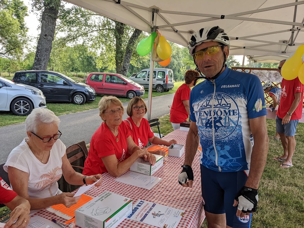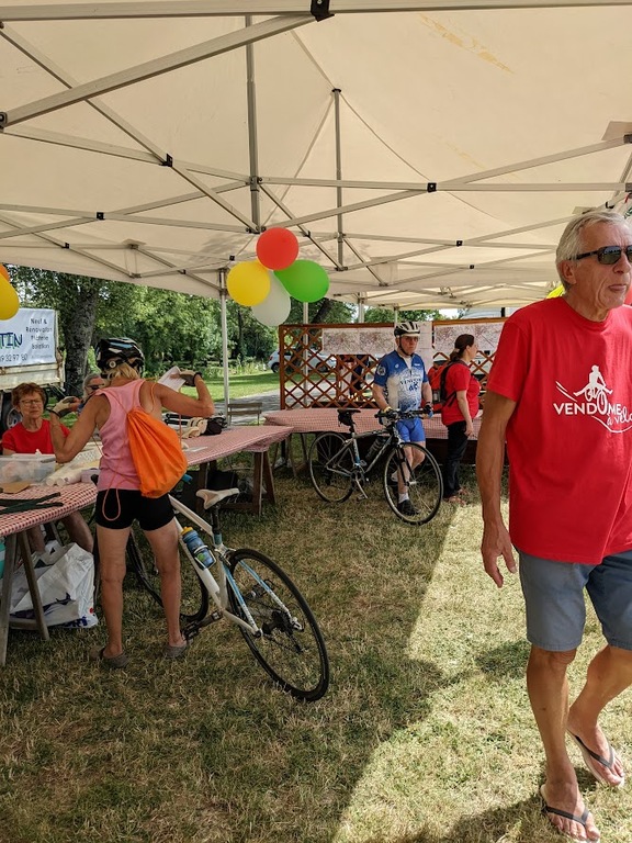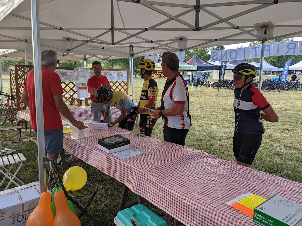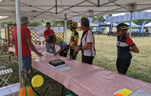 Dès 6h30 tout le monde s'active déjà pour la mise en route; buvette, ravito, animations et exposants divers et bien sûr notre stand d'accueil et inscriptions bien pré-installé le vendredi soir par Christian,Nadine et Marie-Jo. Heureusement car avec la canicule annoncée, dès 7h les inscriptions s'enchaînent sans répit jusqu'à 8H ; un peu rapide pour la mise en route mais finalement ça nous met tout de suite dans le bain . Le reste de la matinée sera plus calme avec quand même des inscriptions intermittentes jusqu'à 11H ; heure à laquelle les premiers partis commencent à rentrer, nous sommes impatients d'avoir leurs commentaires qui s'avèrent être dans l'ensemble positifs pour les parcours , un bémol car sur l'un des circuits le premier point ravito à 80km les a fait peiner un peu mais la majotité a bien paré en s'arrêtant faire le point d'eau dans des cimetières en bord de route..