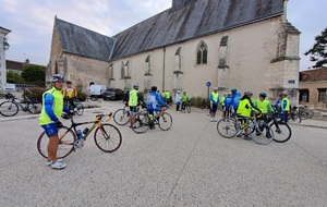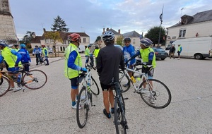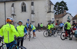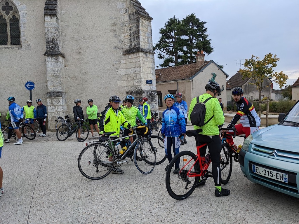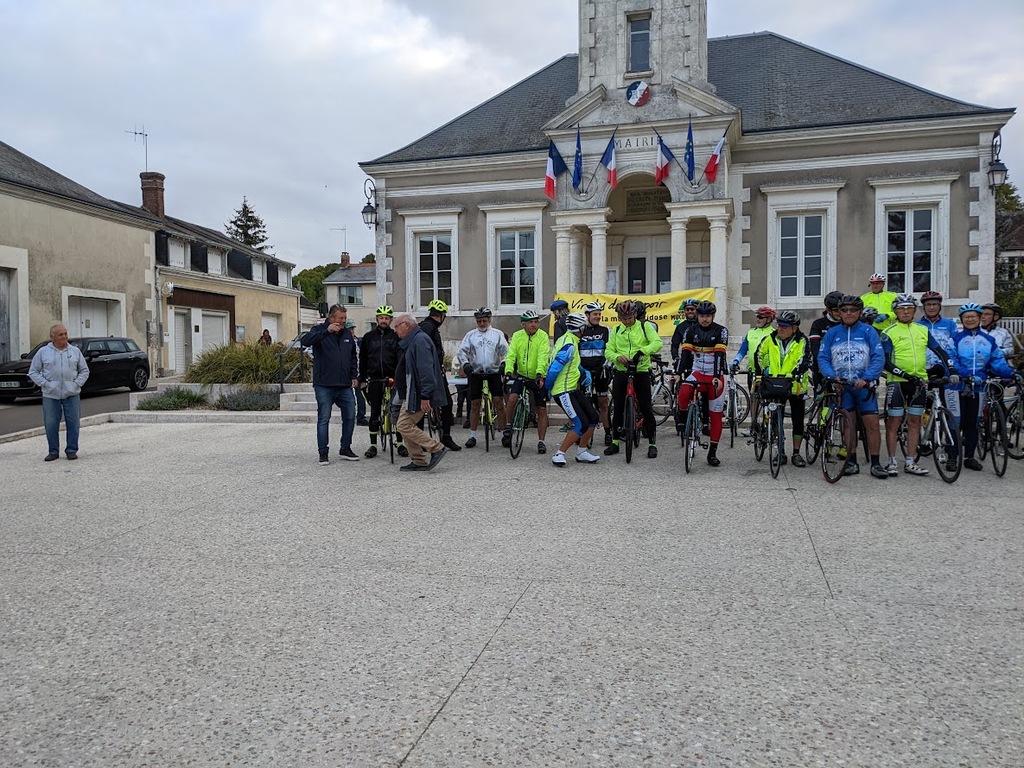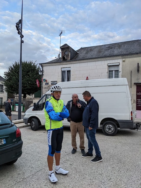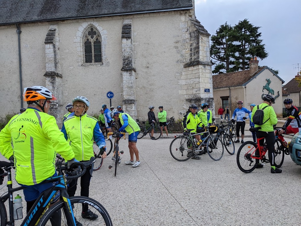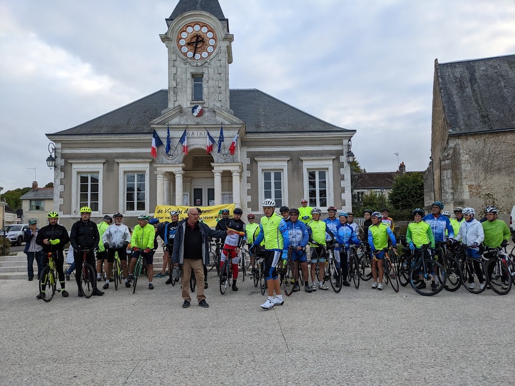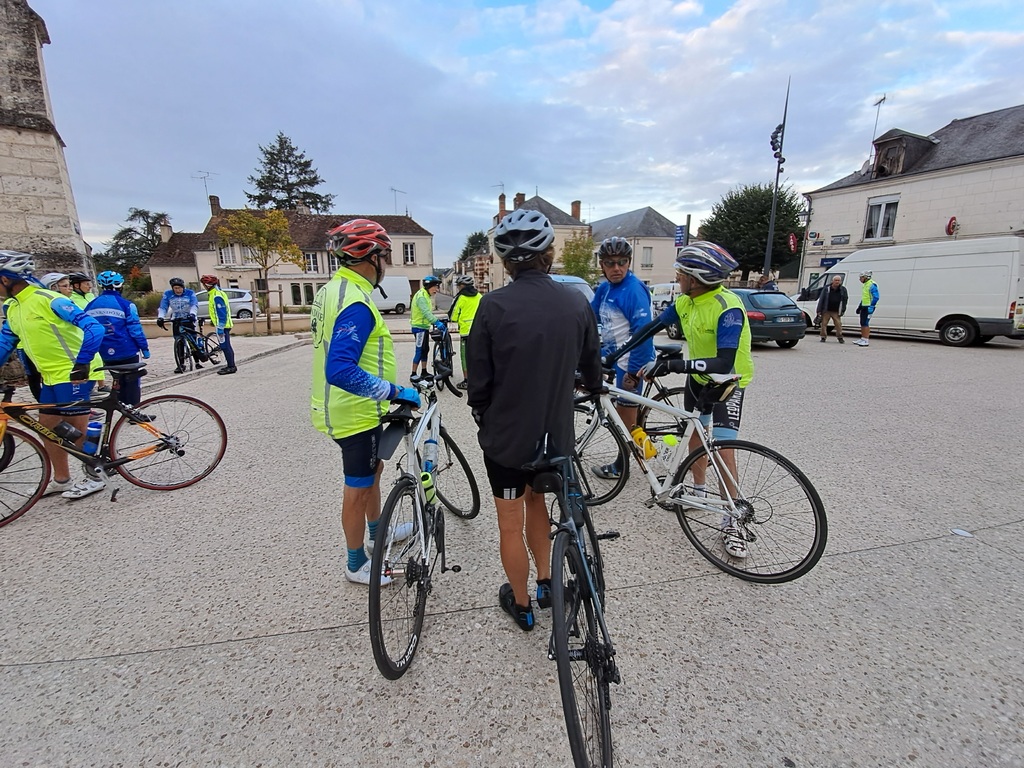 Une quarantaine de cyclos dont beaucoup d'extérieurs au club étaient au départ sous un ciel menaçant. Le début de parcours, vent favorable est bien roulant . Nous arrivons assez rapidement à Montoire où les bénévoles et le maire nous accueillent autour d'un copieux ravito que nous partageons avec le club des voitures de collection qui nous suivent. Un bon moment d'échanges dans une ambiance sympathique.