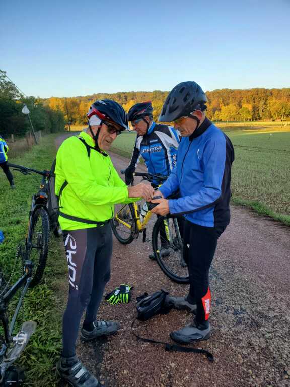 Ultime répétition ce matin pour reconnaître le petit circuit et une boucle vers Mazangé. Nous n'avions pas l'habitude mais le terrain commence à être gras. Jusqu'à la Guinguette du Gué du Loir, tout est parfait l'équipe 1 s'en est bien tirée, pas d'erreur. Là, nous partons vers la première boucle, changement d'équipe. Un peu plus de côtes, nous arrivons à l'endroit du casse-croûte quelques minutes de repos et nous prenons cette côte, très dure,quelques-uns montent à pied, un petit replat nous permet de se remettre en selle et hop nous sommes en haut.Nous décidons de passer à Villiers pour boire un verre de bernache, peut-être le dernier, mais, personne pour nous accueillir donc nous rentrons sur Courtiras. Belle balade avec une crevaison. M.Jo