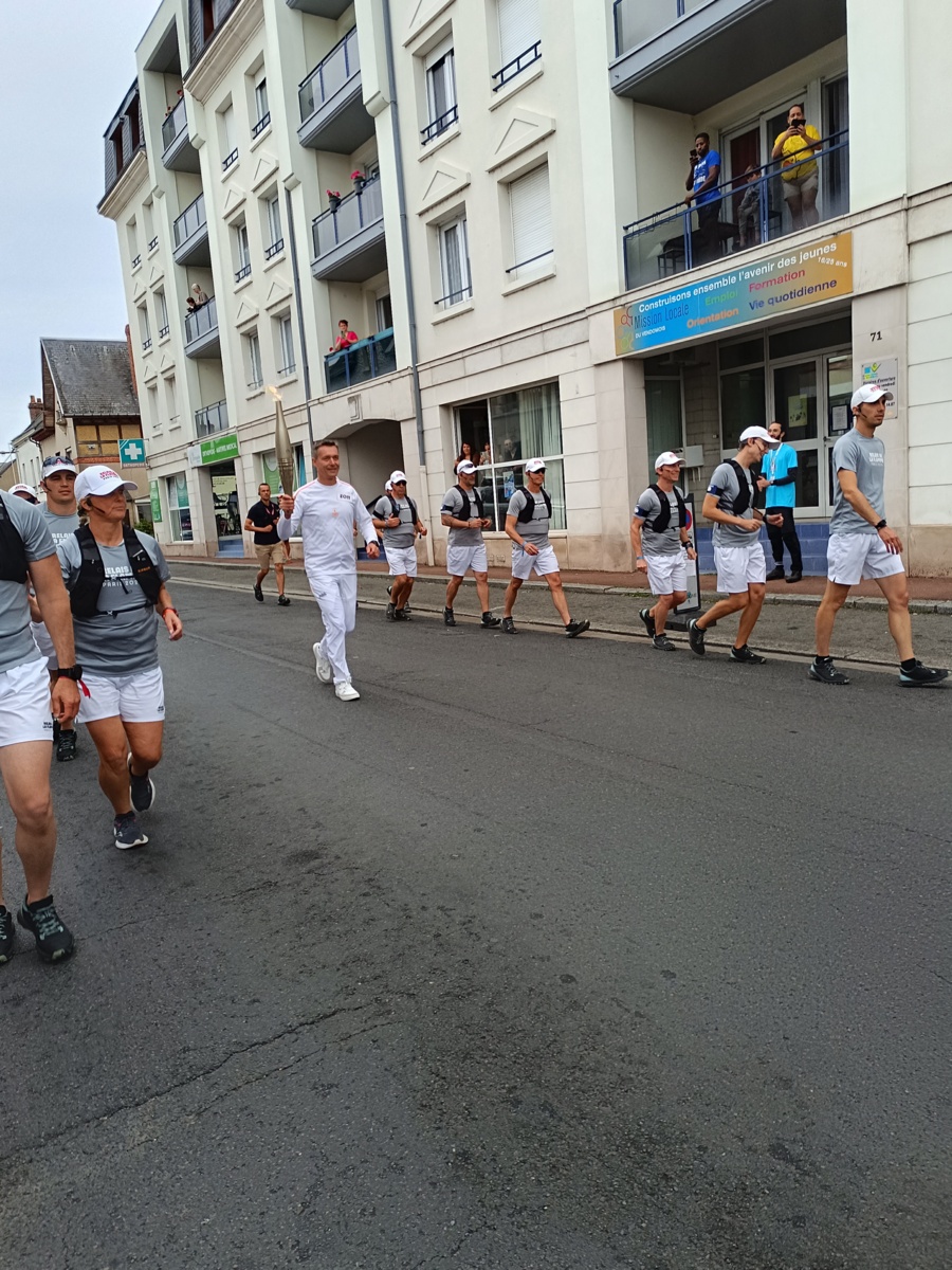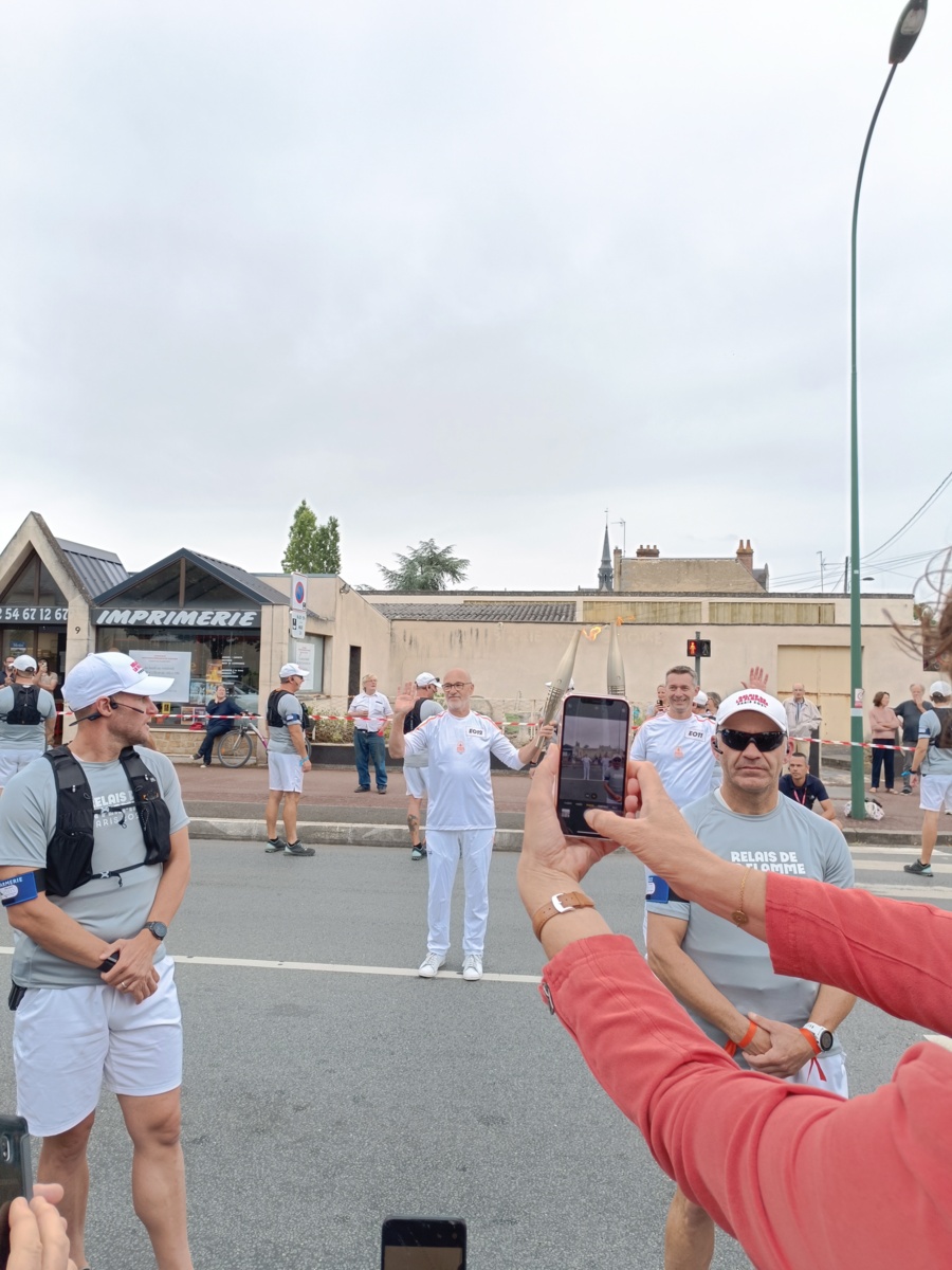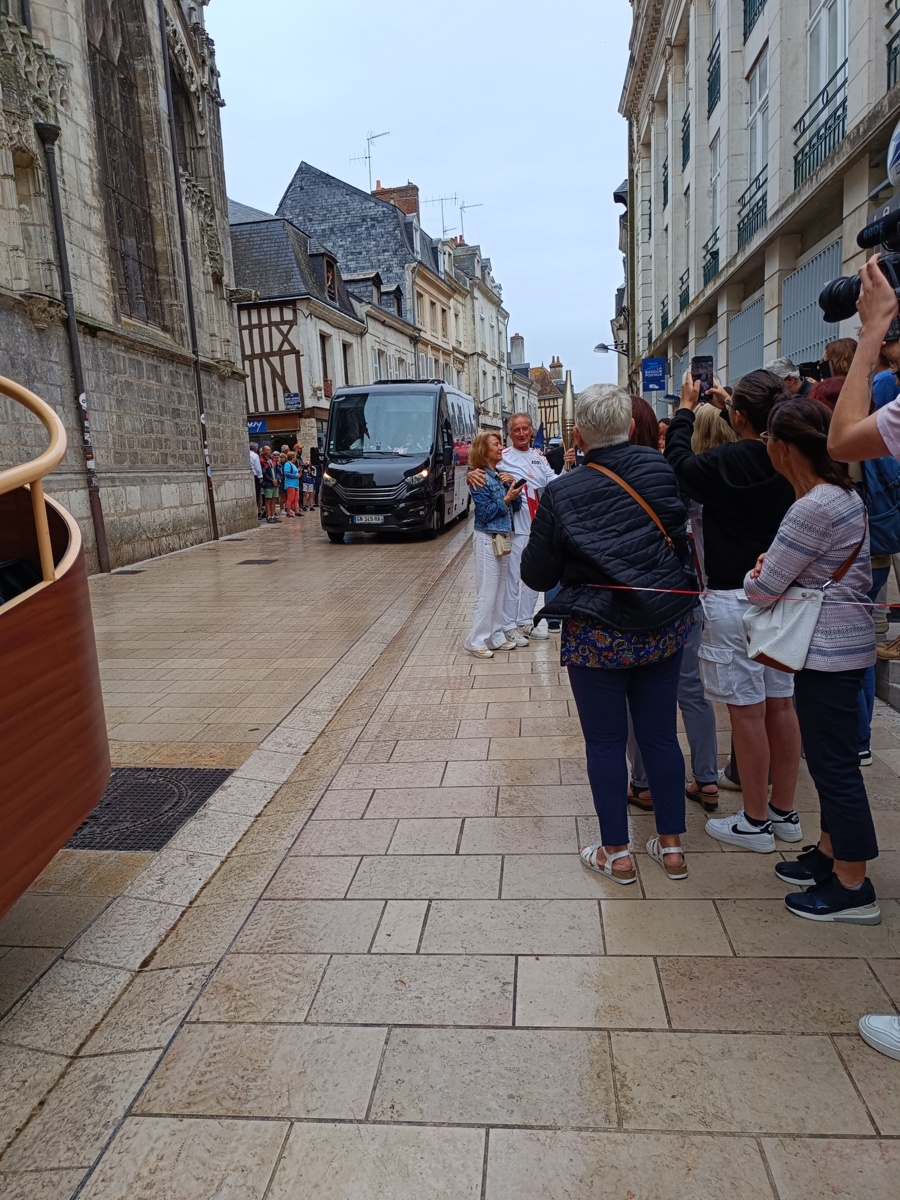 Quelle belle matinée ce lundi 8 juillet, la flamme Olympique est de passage à Vendôme. Partie très tôt pour être aux premières places à la sortie du stade Léo Lagrange, l'attente est longue mais il y a beaucoup de passage à cet endroit. Un déploiement de policiers, tous les notables de la région, des CRS, beaucoup de voitures de police, la flamme sera bien protégée. Enormément de monde agglutiné devant cette porte et enfin on nous autorise à entrer pour voir l'allumage du chaudron. Nous partons ensuite vers la ville avec un changement de personne tous les 200 m. Les relayeurs ont été briffé pour suivre un protocole, de face, tourner à droite, tourner à gauche pour que la population les voit bien. Plus nous descendons vers la ville plus le monde augmente c'est incroyable la presse parle de 12000 personnes. Au carrefour de l'avenue Gérard Yvon, c'est le tour de Jérôme d'allumer la flamme et prendre le relais. Jérôme, bien connu des Vendômois, licencié à notre club, à l'origine de "Vendôme à vélo" il est acclamé par tous, il savoure ce moment qui sera inoubliable. Nous continuons, devant la poste c'est Robert qui prend la flamme. Là c'est le délire, tous les Vendômois scandent "Robert, Robert" très connu lui aussi dans le Vendômois pour ses actions dans le sport et surtout la boxe.Robert très ému salue la foule, l'enthousiasme suscité par celle-ci fait ressentir un grand moment de fierté et de satisfaction. Quels moments de partage incroyables, fabuleux, nous ne reverrons pas celà.
