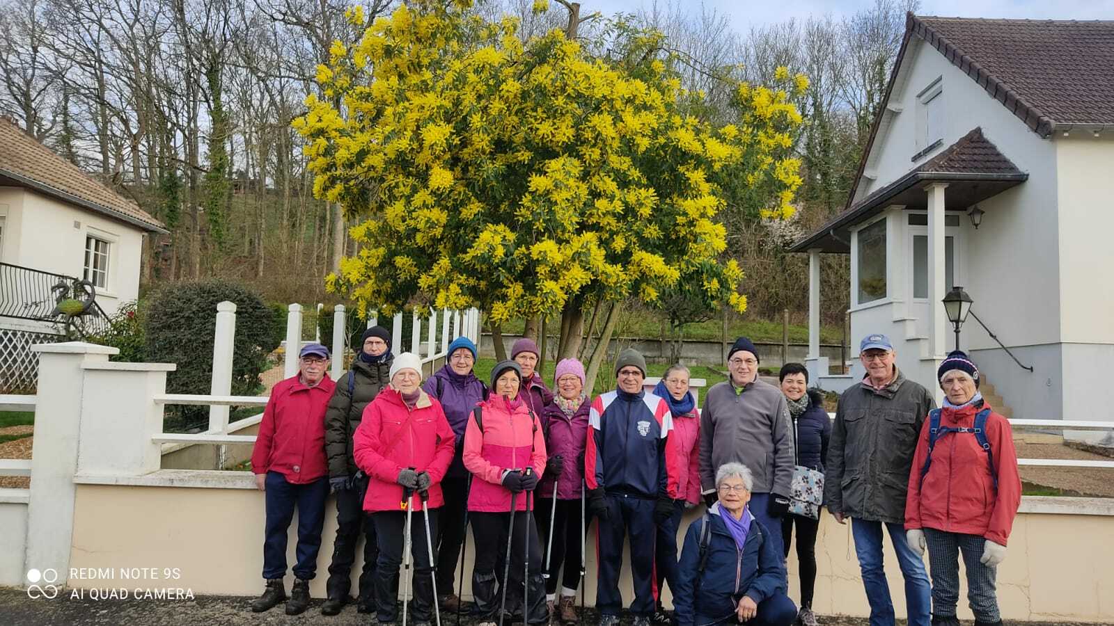 Quinze personnes étaient au départ de Courtiras ce matin pour la marche. Il fait froid mais nous démarrons par une côte donc ça réchauffe. Nous passons devant un magnifique mimosa, comme si nous étions dans le midi, impossible de ne pas prendre une photo, c'est un petit goût de printemps. Nous avons beaucoup d'eau dans certains chemins, mais ça passe. Le compteur à l'arrivée affiche 12 km, belle balade avec le soleil. M.Jo