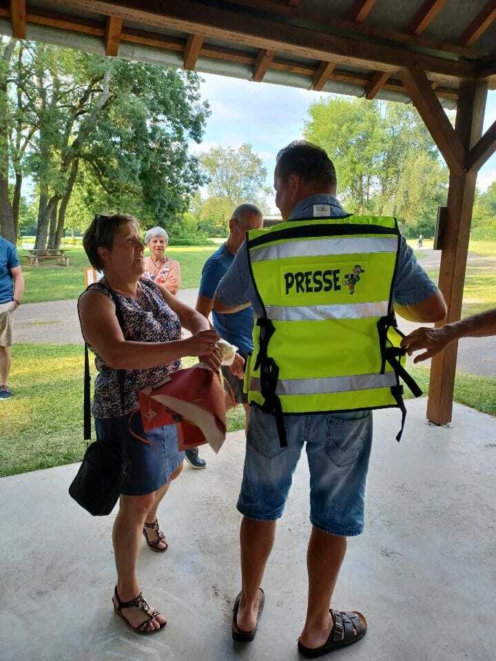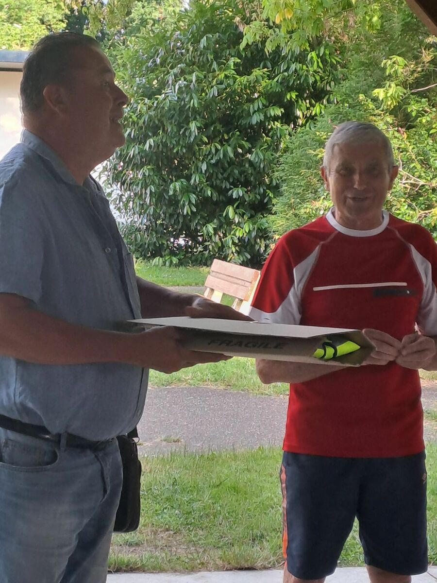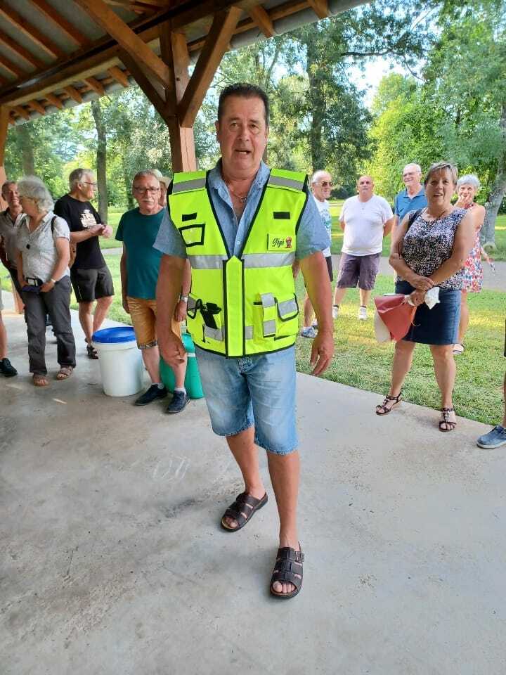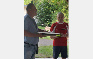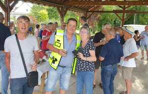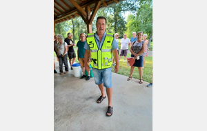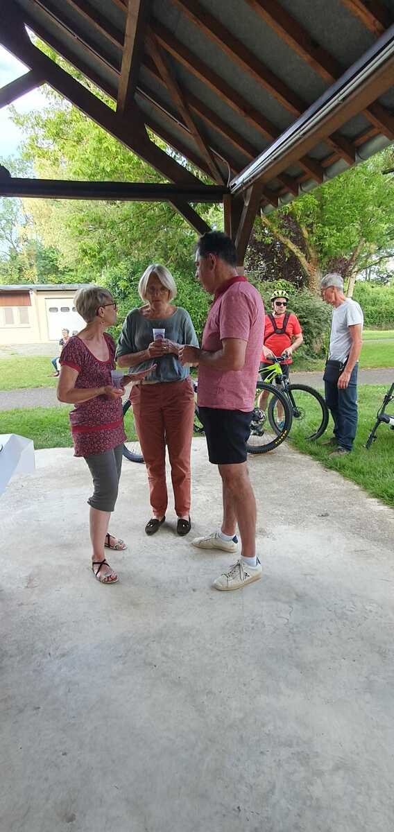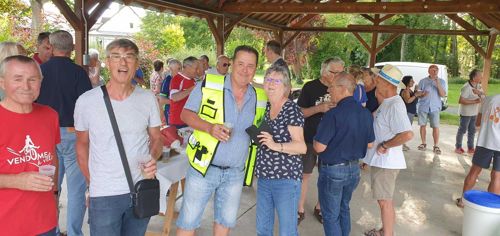A 18h30 affluence à la Charreterie, les cyclos pouvaient emmener leurs conjoints et Madame le Maire était invitée. Quand Gérard arrive, Alain prend la parole et vante son travail , toujours de belles photos pendant nos randonnées. Je remercie ensuite son épouse qui le supporte et lui offre un bouquet. Gérard ouvre son cadeau: un superbe gilet jaune de "presse ". Gaêtan en profite pour encenser Christian, et il le mérite, pour tout le travail accompli , les circuits sur Vendôme et Saint-Ouen. Beaucoup d'applaudissements pour eux.