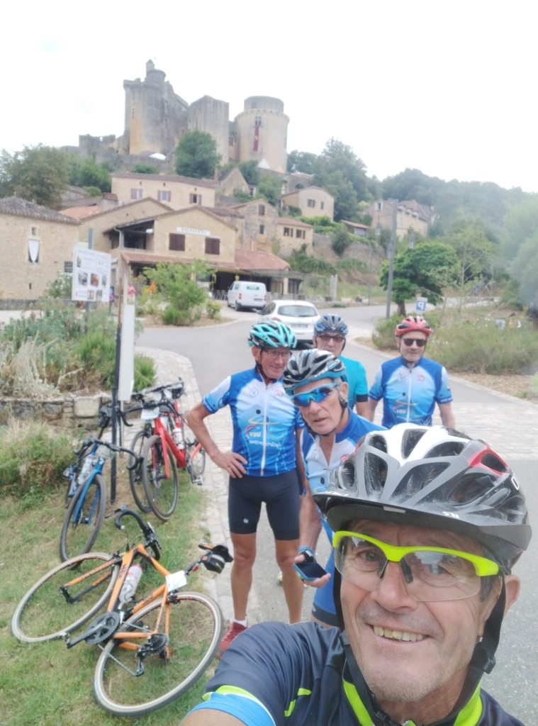Lundi, après un peu de pluie dans la nuit nous partons sur 62 km, les costauds, cinq à six sont devant notre groupe de dix, Momo et Brigitte tous les deux sauf Francis parti seul sur le 80 km. Plusieurs ont eu peur de la pluie et sont restés sous la couette. Nous avons fait une halte avec photo sur "la butte de Montcuq"